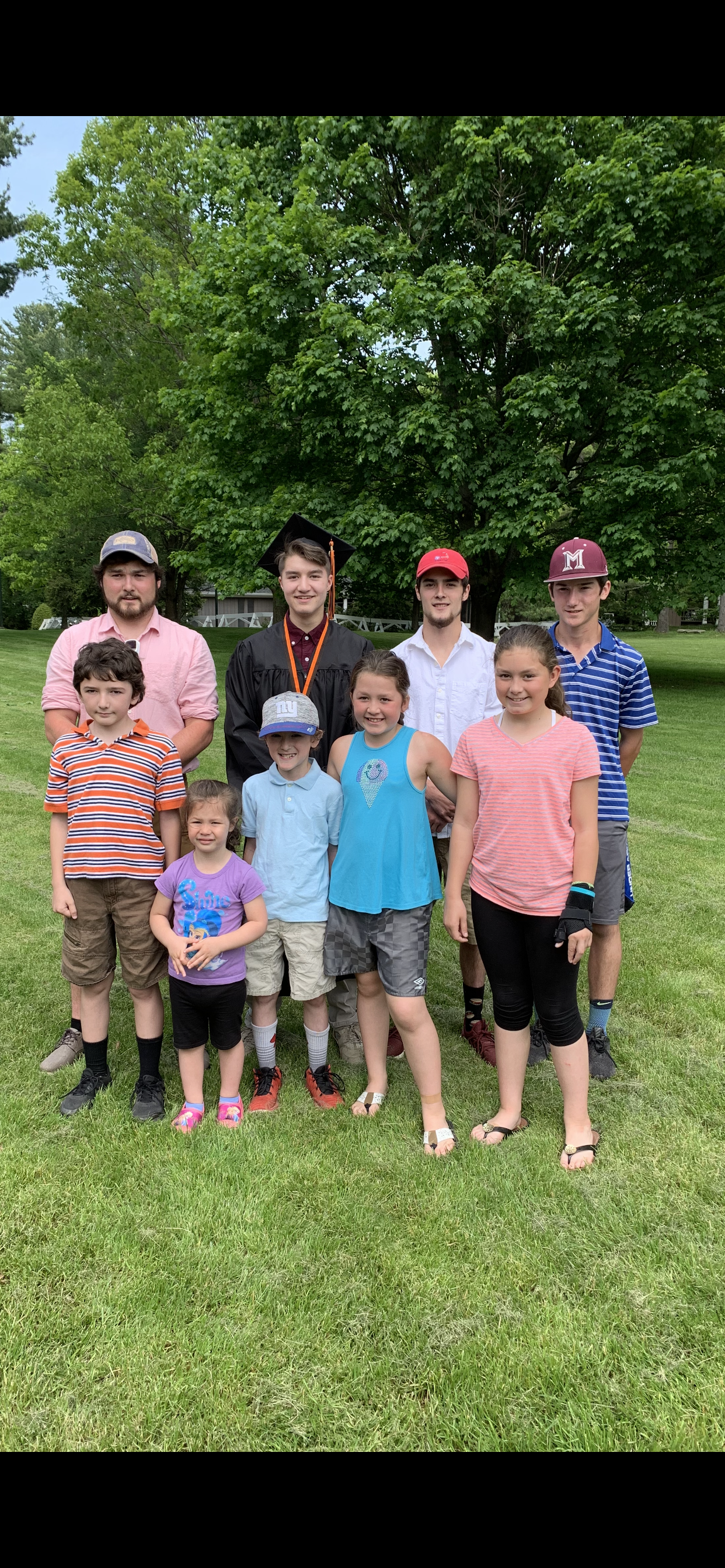 Large family portrait painting, including a graduate.