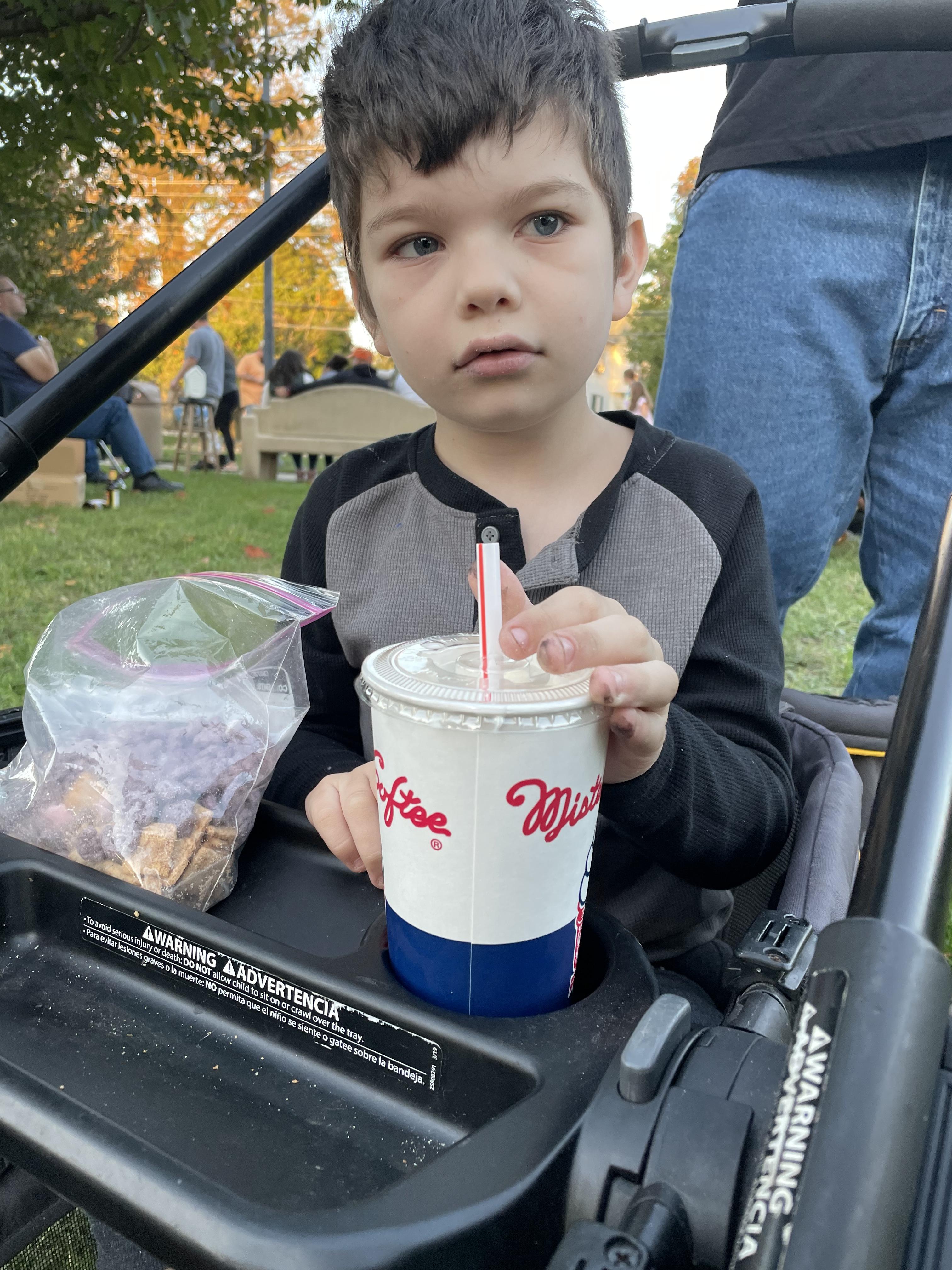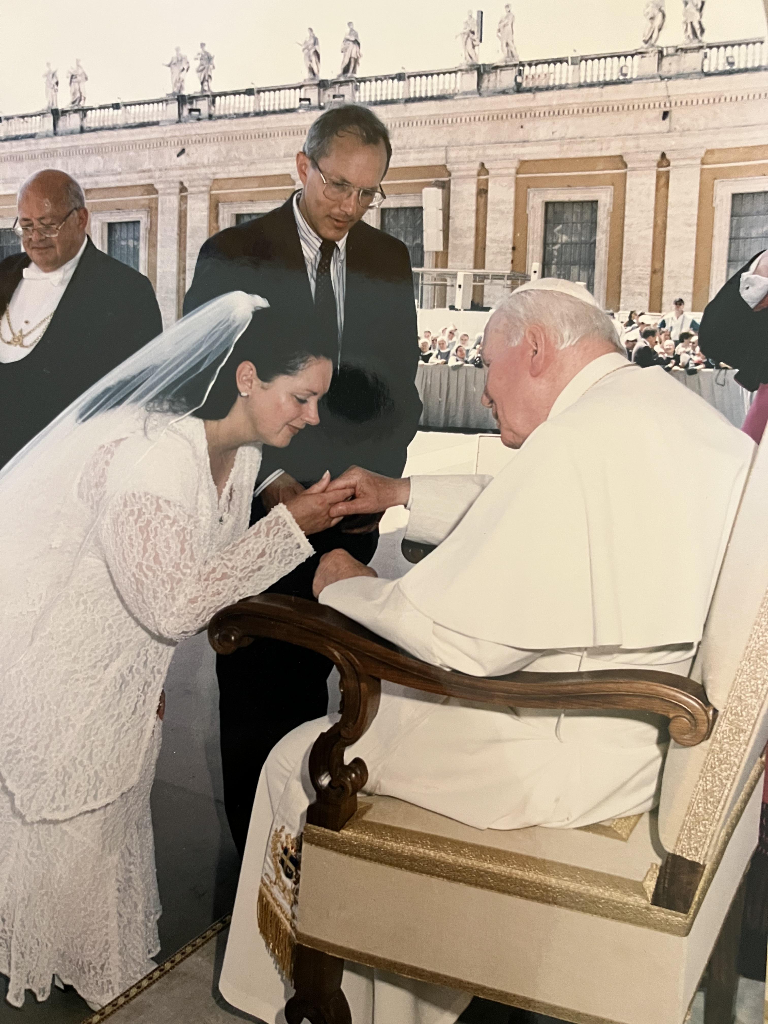 Painting of a bride kneeling before Pope John Paul II, with a man and another man in the background.