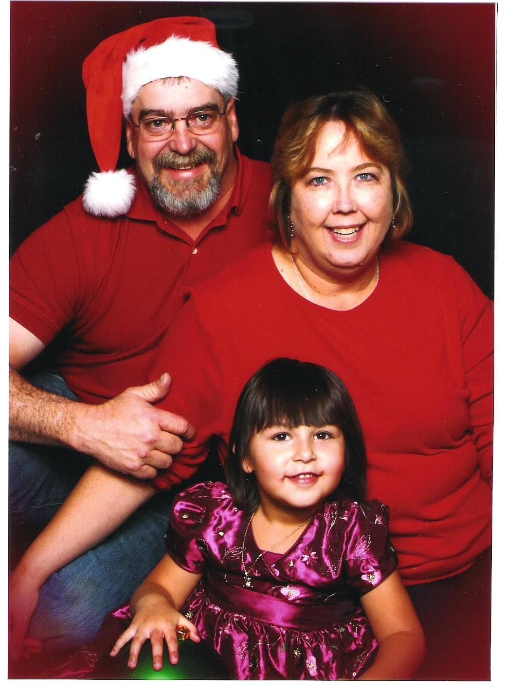 Family Christmas portrait: father wearing Santa hat, mother, and young daughter.