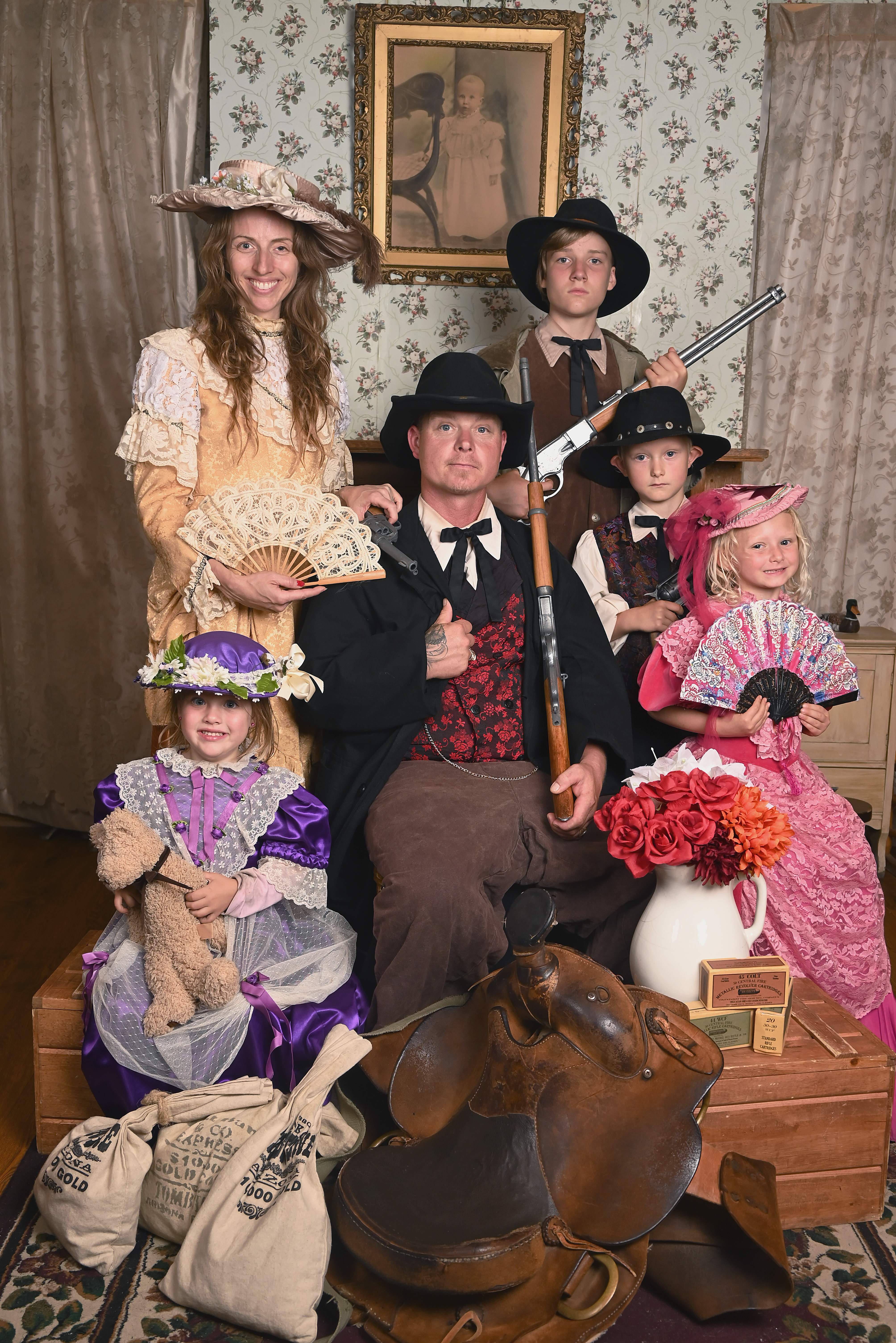 Painting of a family dressed in Western attire, posing with rifles.