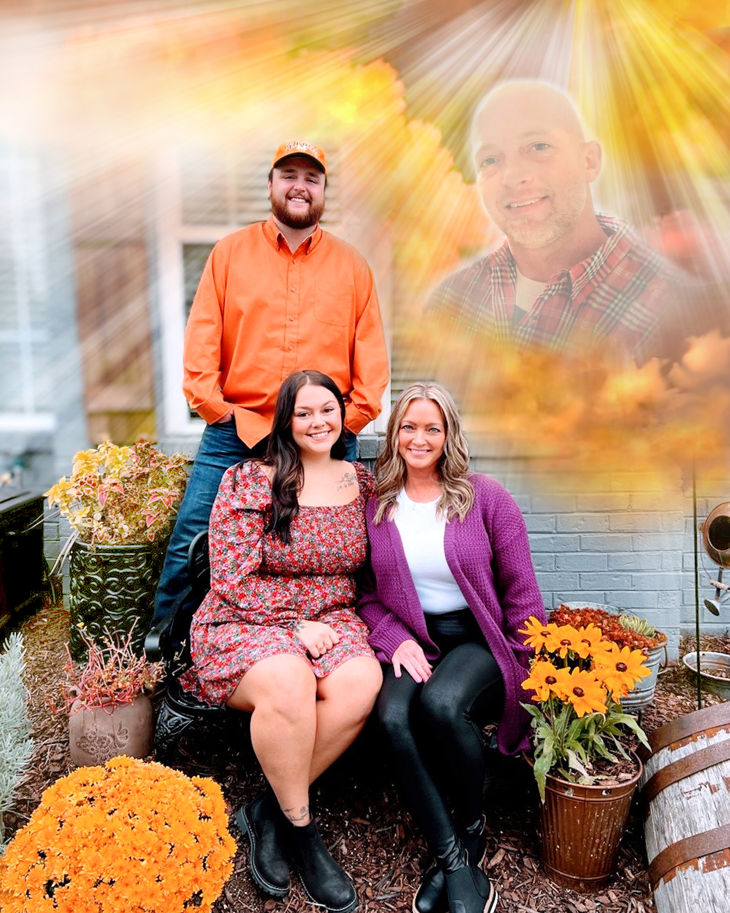 Painting of a family portrait, three people seated below a larger image of a deceased man.