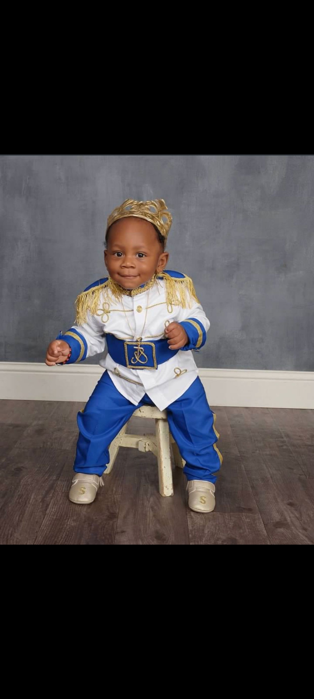 Family portrait painting of a mother wearing a tiara, father, and baby wearing a crown and princely outfit.