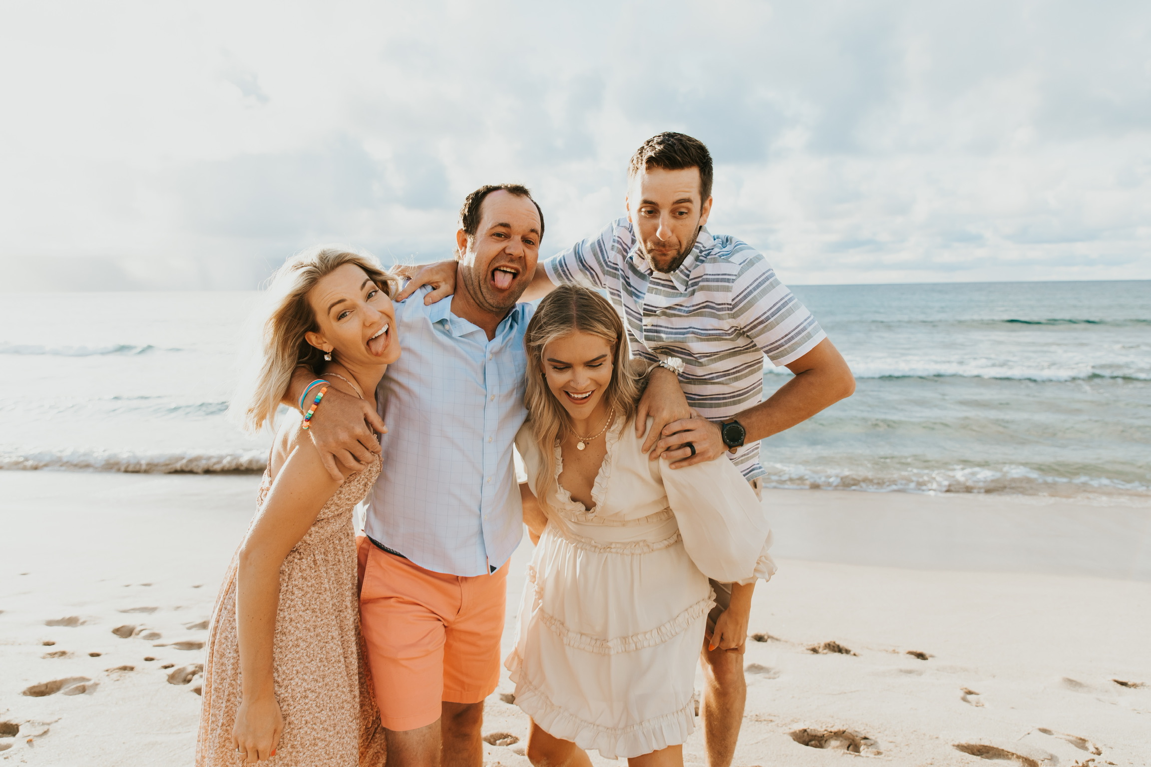 Painting of two men carrying two women on their backs on a beach, one man has angel wings.
