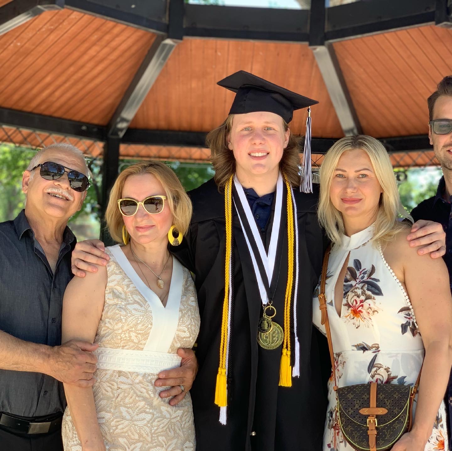 Painted portrait of a multigenerational family, many wearing graduation caps and gowns.