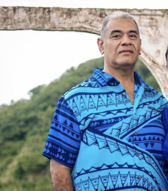 Man holding family portrait painting depicting five people by the ocean.