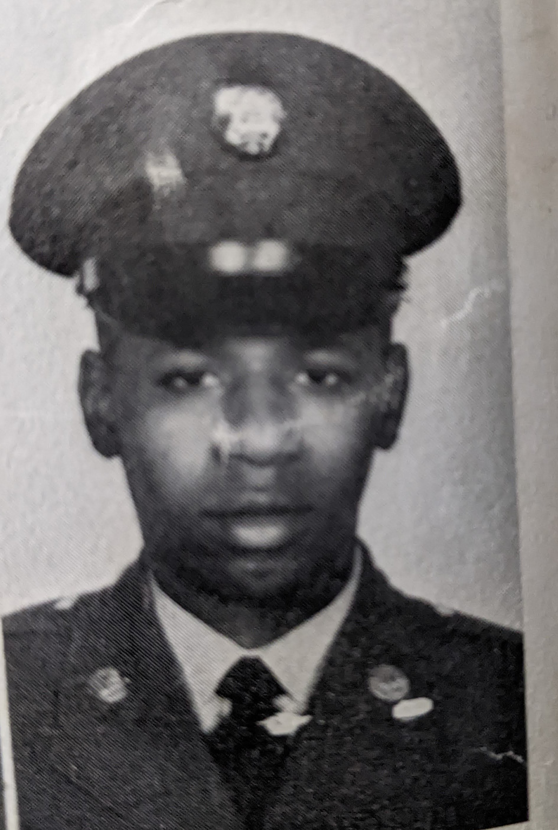 Portrait of four young Black men in military uniforms, in front of an American flag.