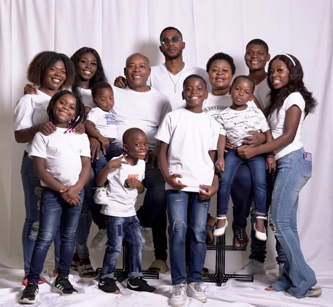 Large family portrait painting, everyone wearing white shirts and jeans against a green background.