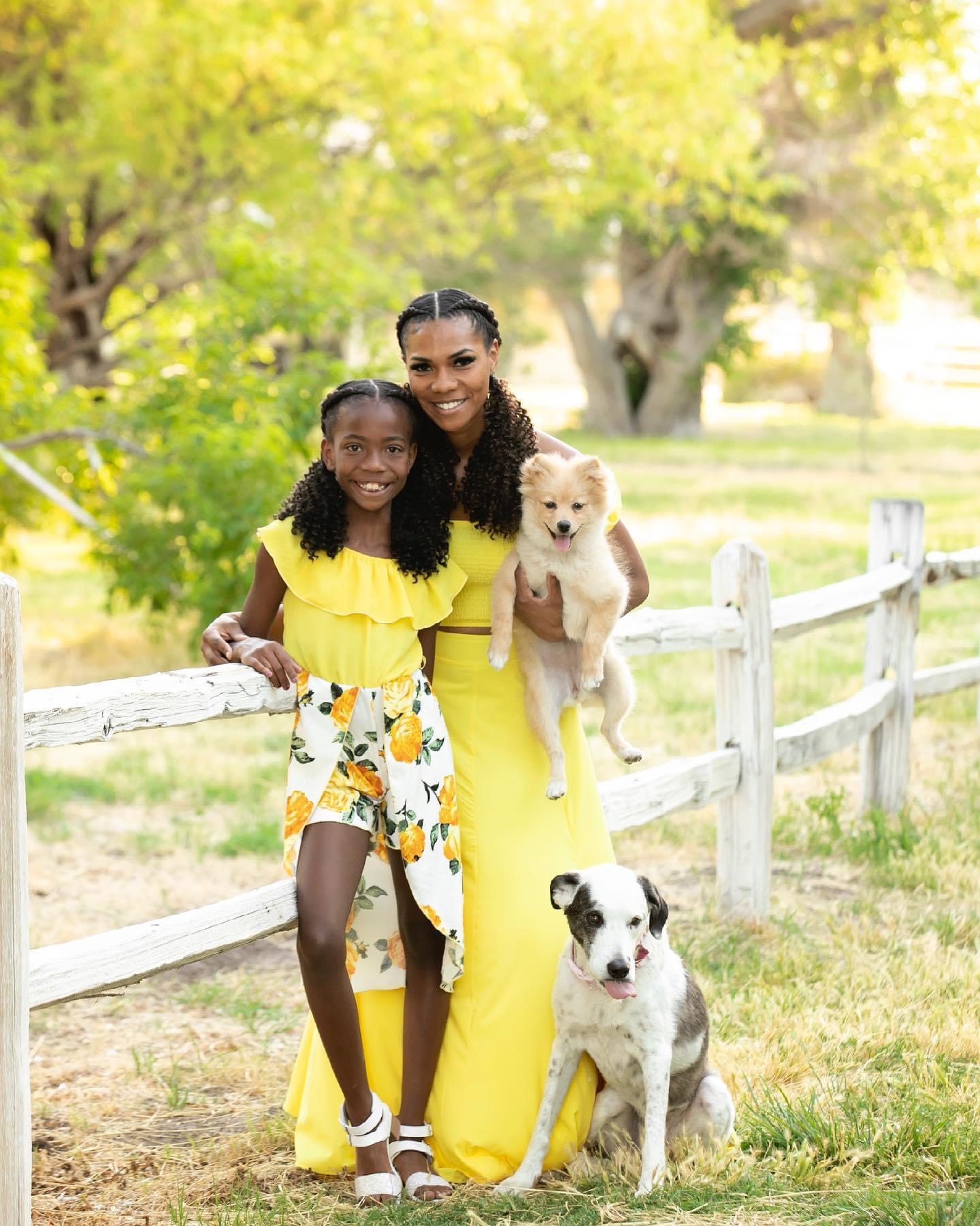Family portrait painting: a smiling man, woman, and girl in yellow.