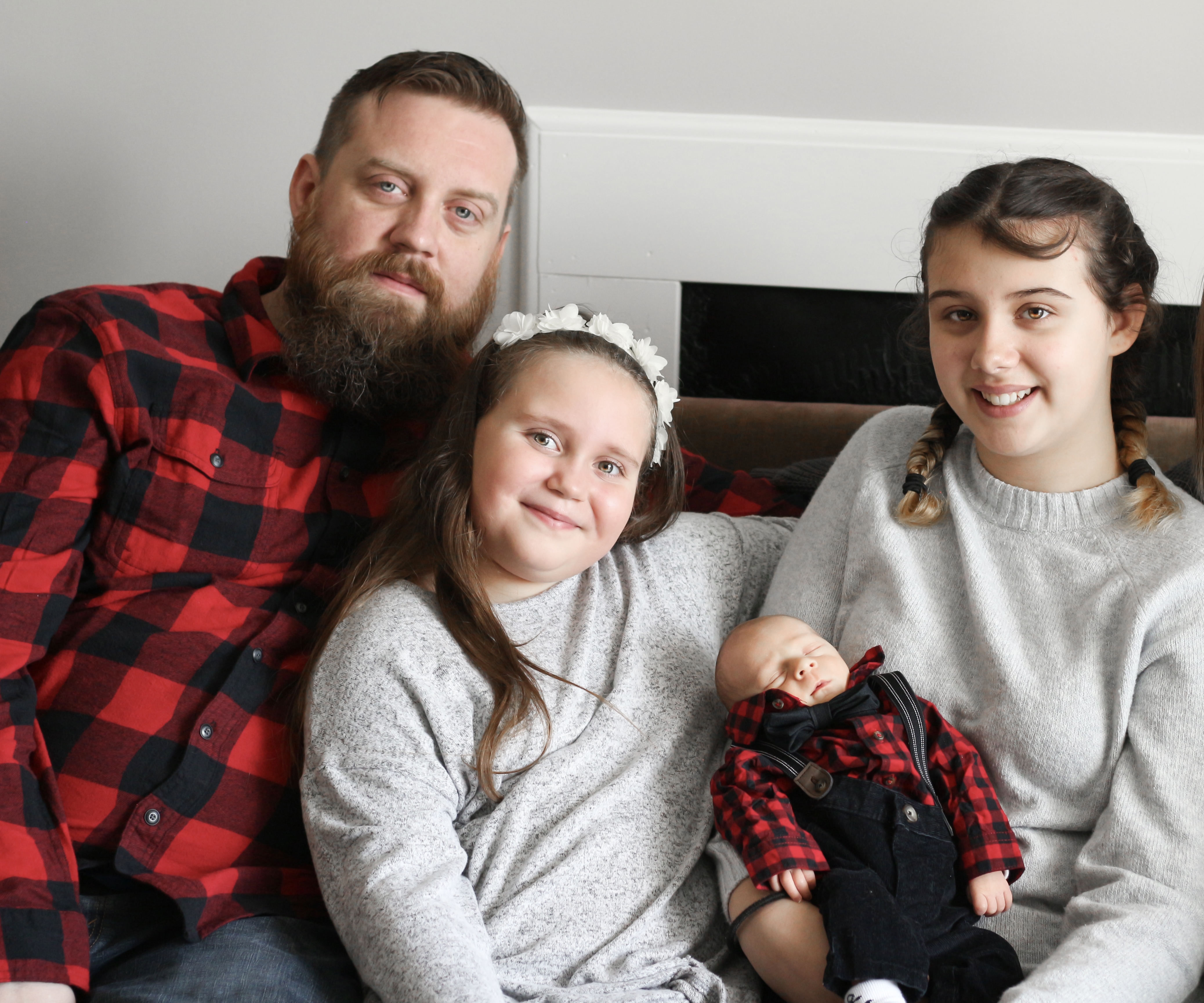 Family portrait painting: two adults, two girls, and a baby.