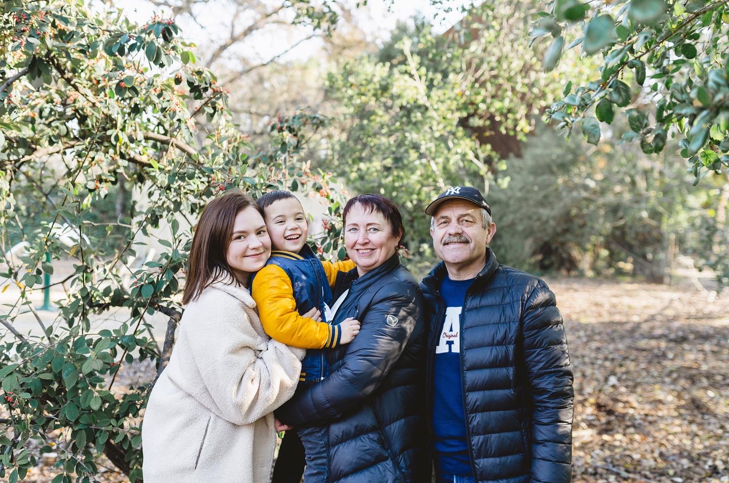 Family portrait painting: two women, a man, and a young boy.
