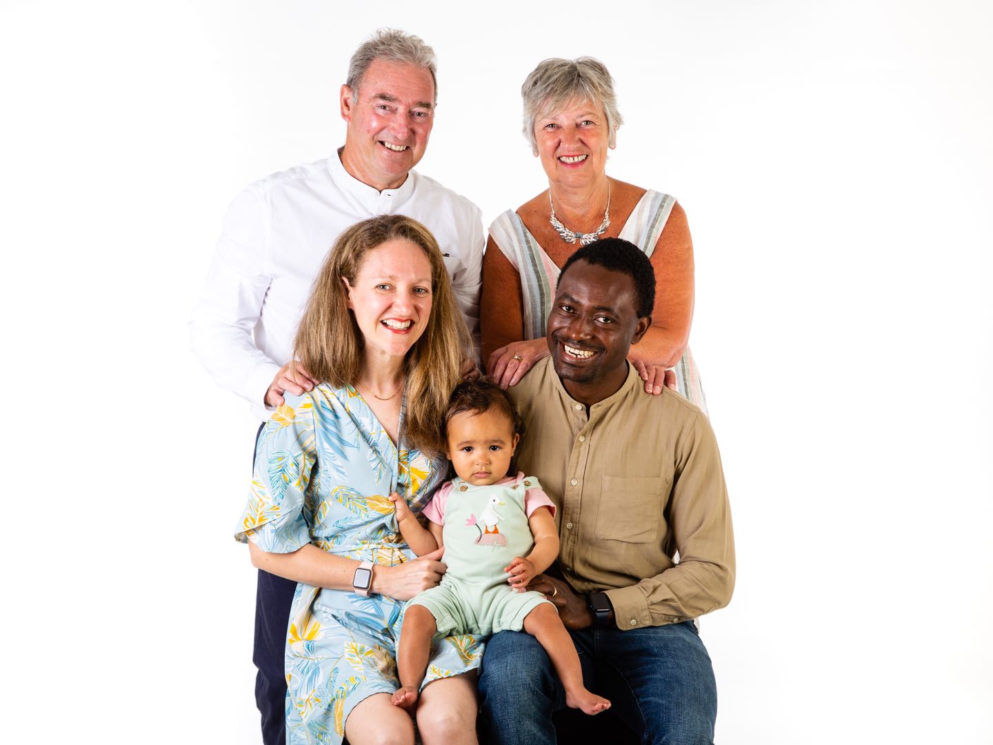 Painted portrait of a multiracial family: two older adults, a young couple, and their baby.