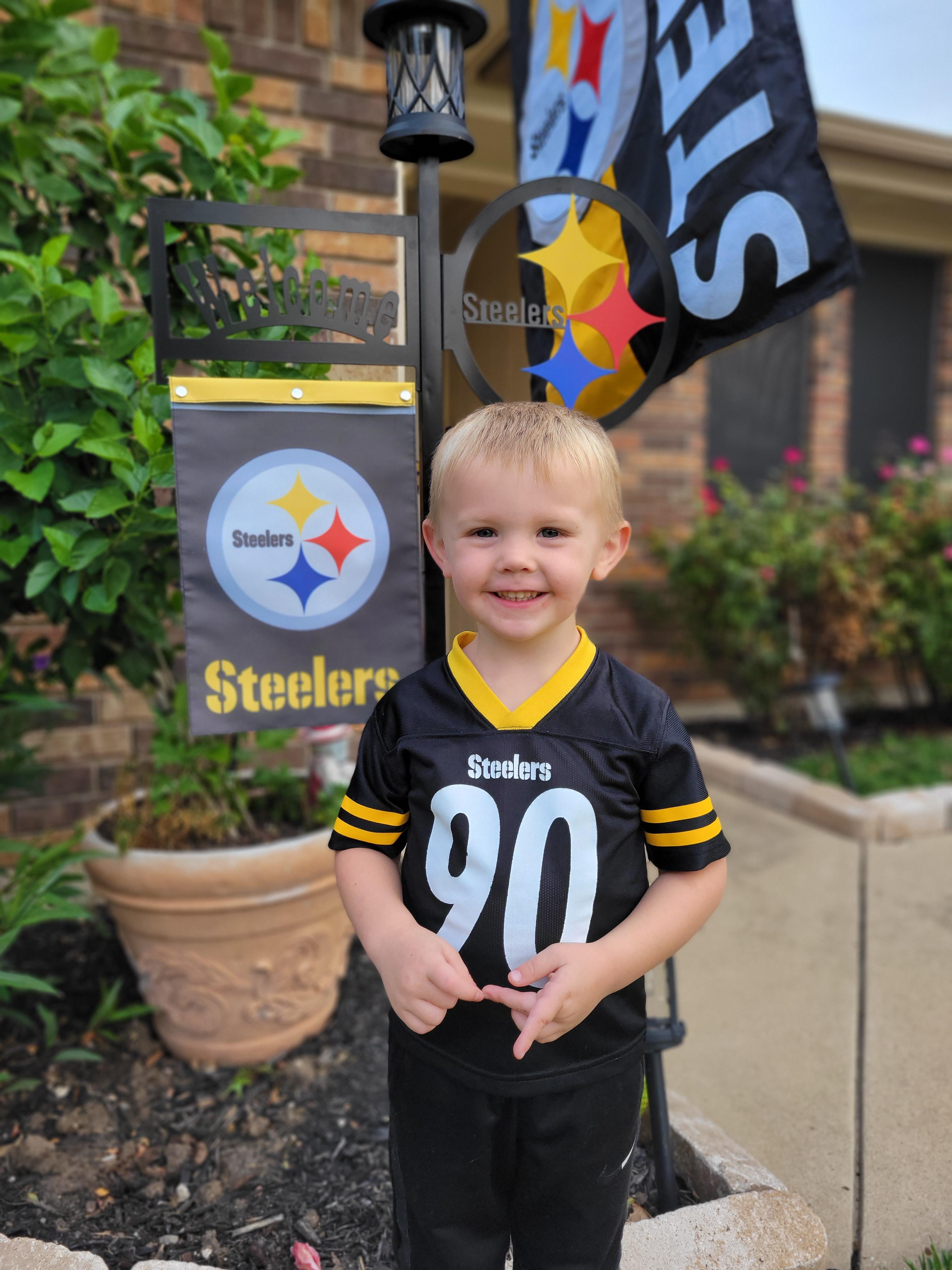Painting of four generations of a family wearing Pittsburgh Steelers jerseys.