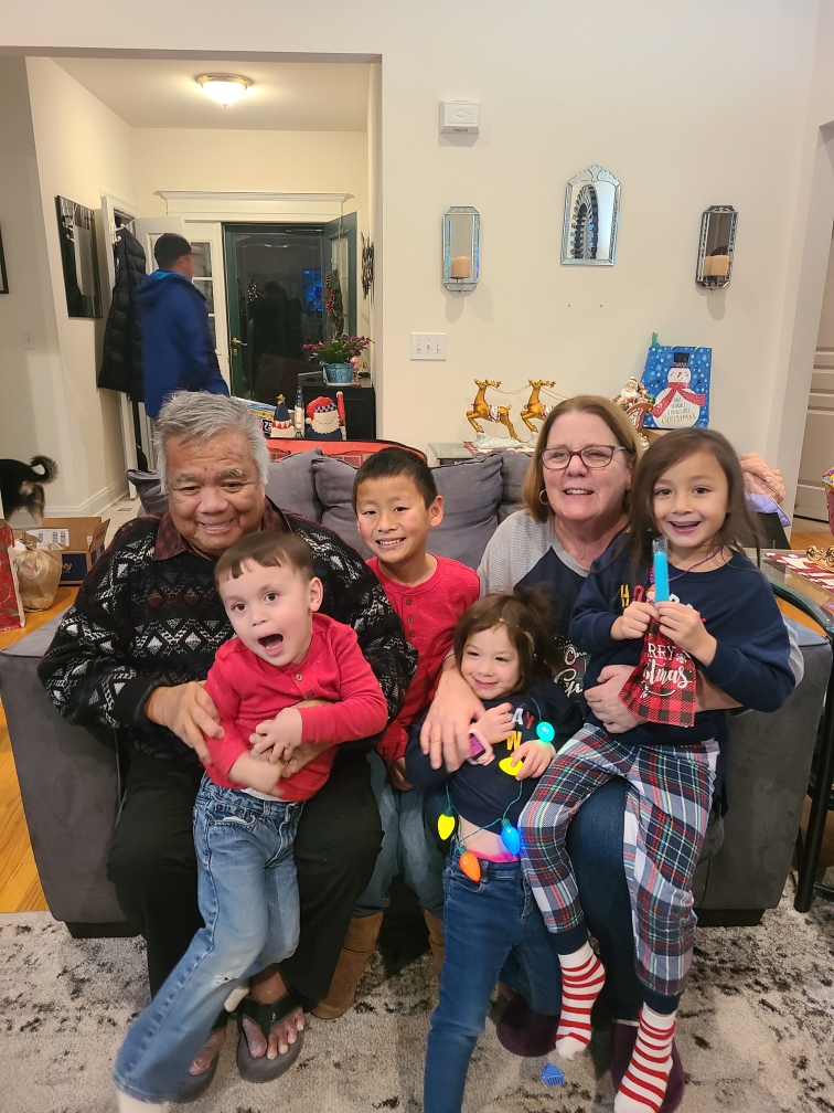 Oil painting of a multigenerational family portrait, a grandfather, grandmother, and four grandchildren.