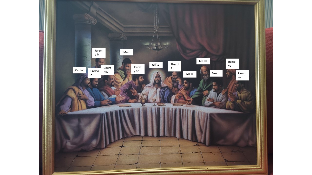 Painting of a family in the style of the Last Supper.