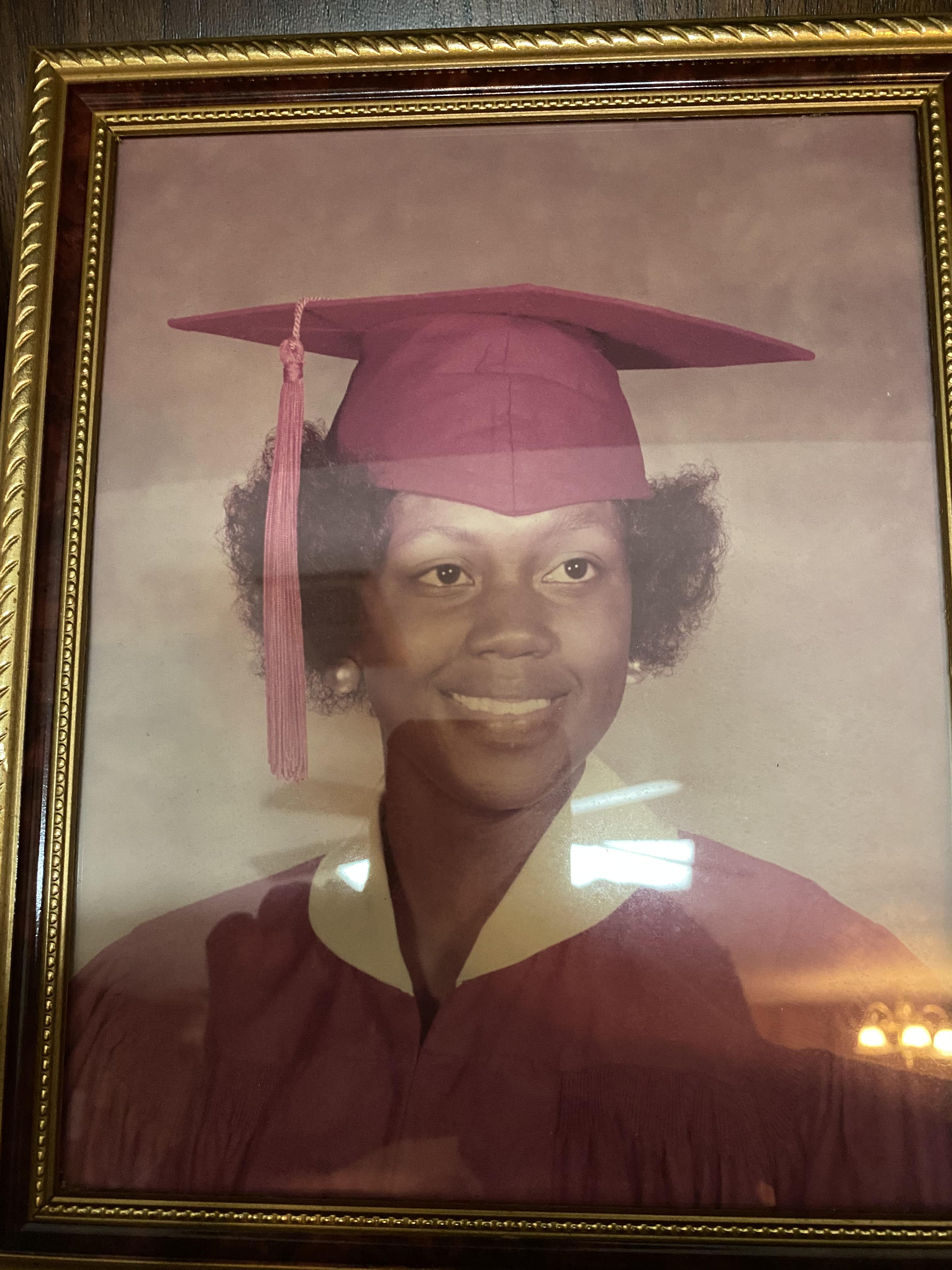 Painted portrait of a Black family, five graduates in maroon caps and gowns with their mother.