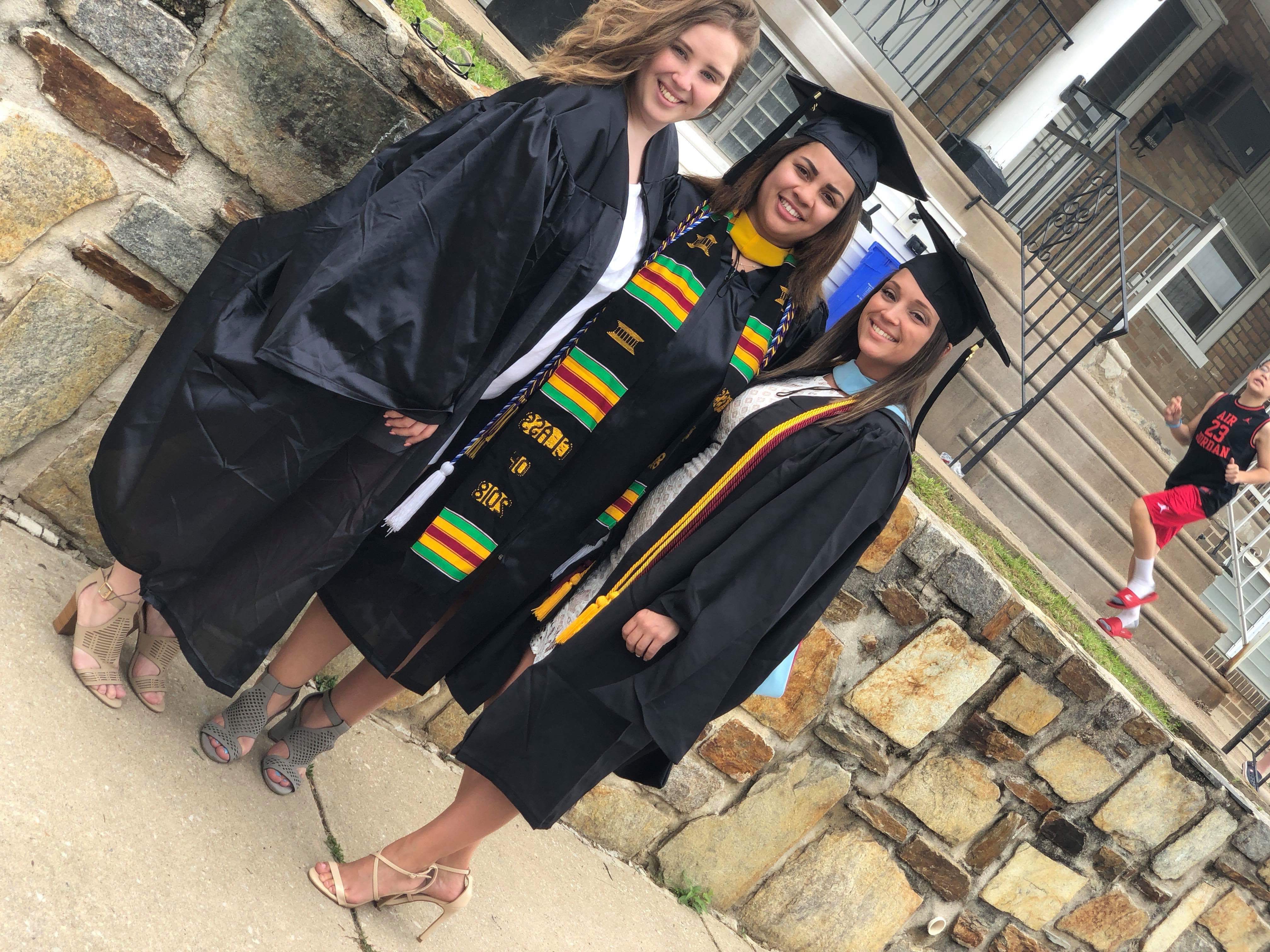 Painted portrait of a man with two graduating women.
