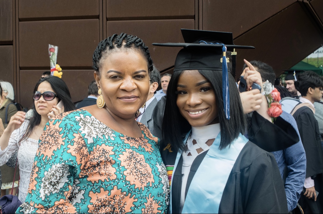 Oil painting portrait of a mother and her graduating daughter.