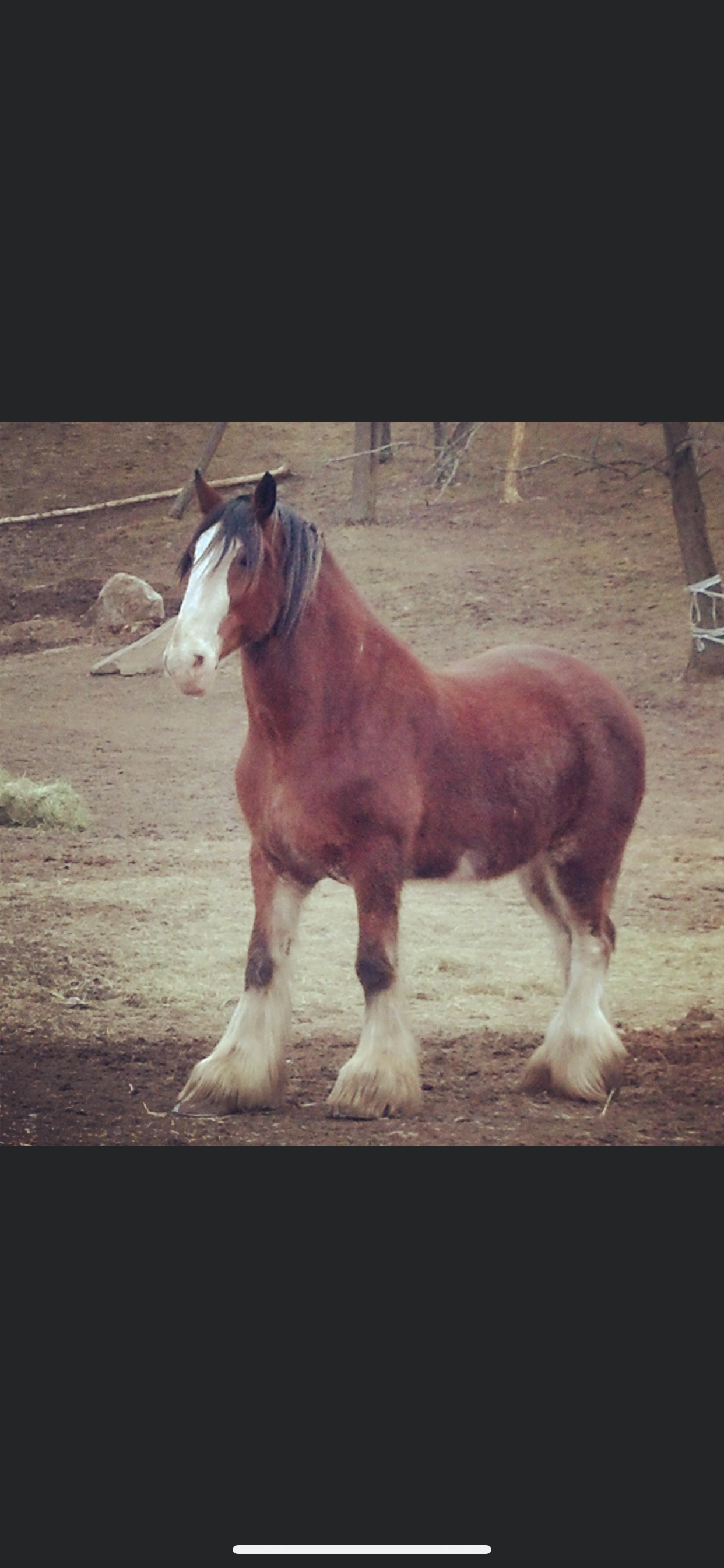 Painting of two chestnut Clydesdale horses with white markings on their legs and faces, standing side-by-side.