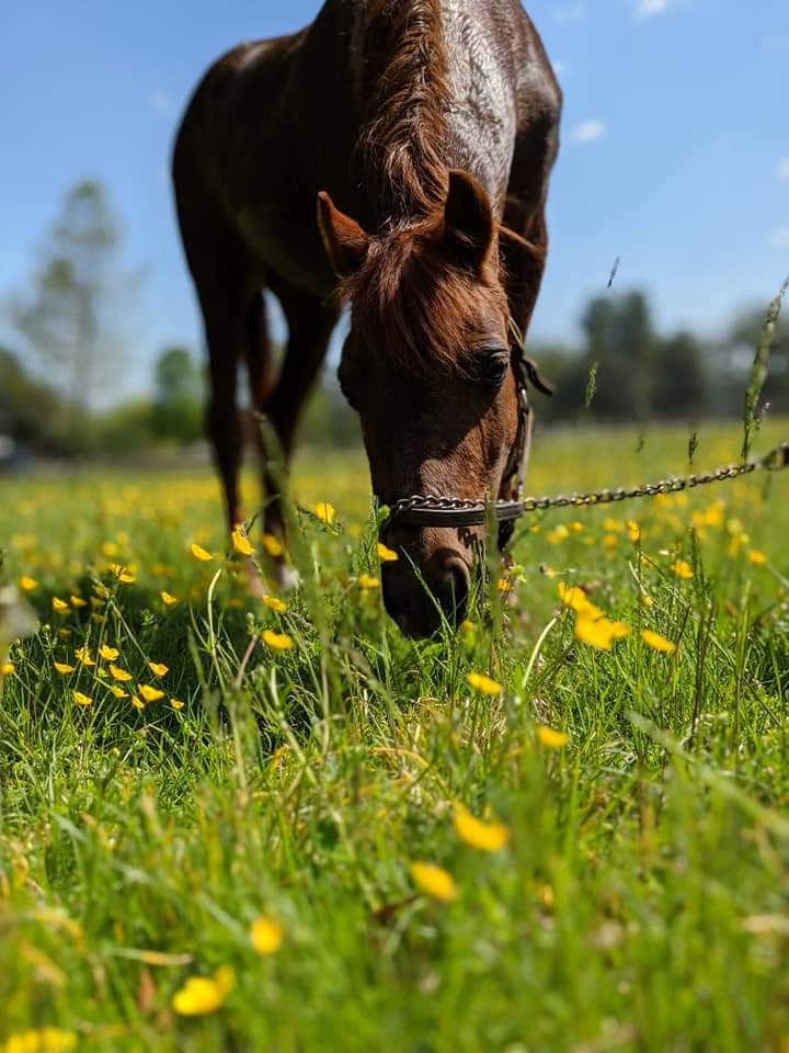 Painting of a person sitting in a field of yellow flowers with two horses.