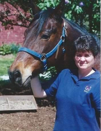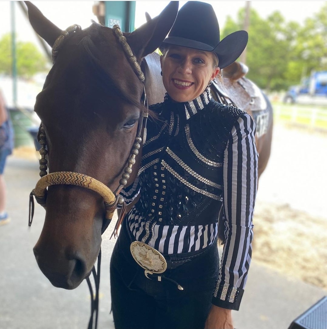 Painting of a smiling woman in a black and white striped show shirt and cowboy hat standing next to a brown horse.