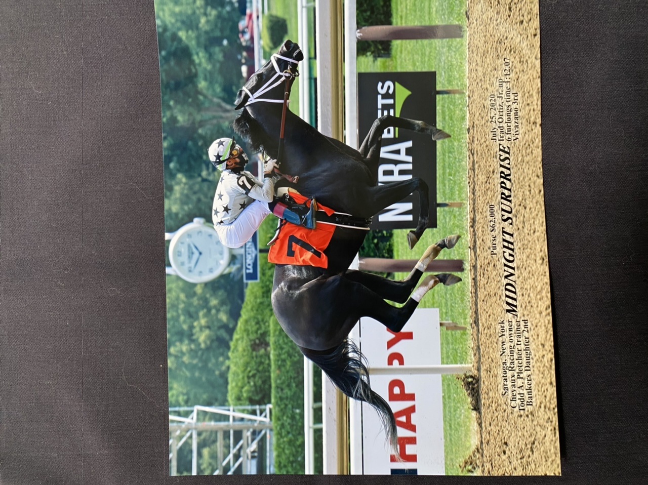 Painting of a black racehorse running, jockey wearing a grey jacket with stars, number 7 on the horse`s saddle.