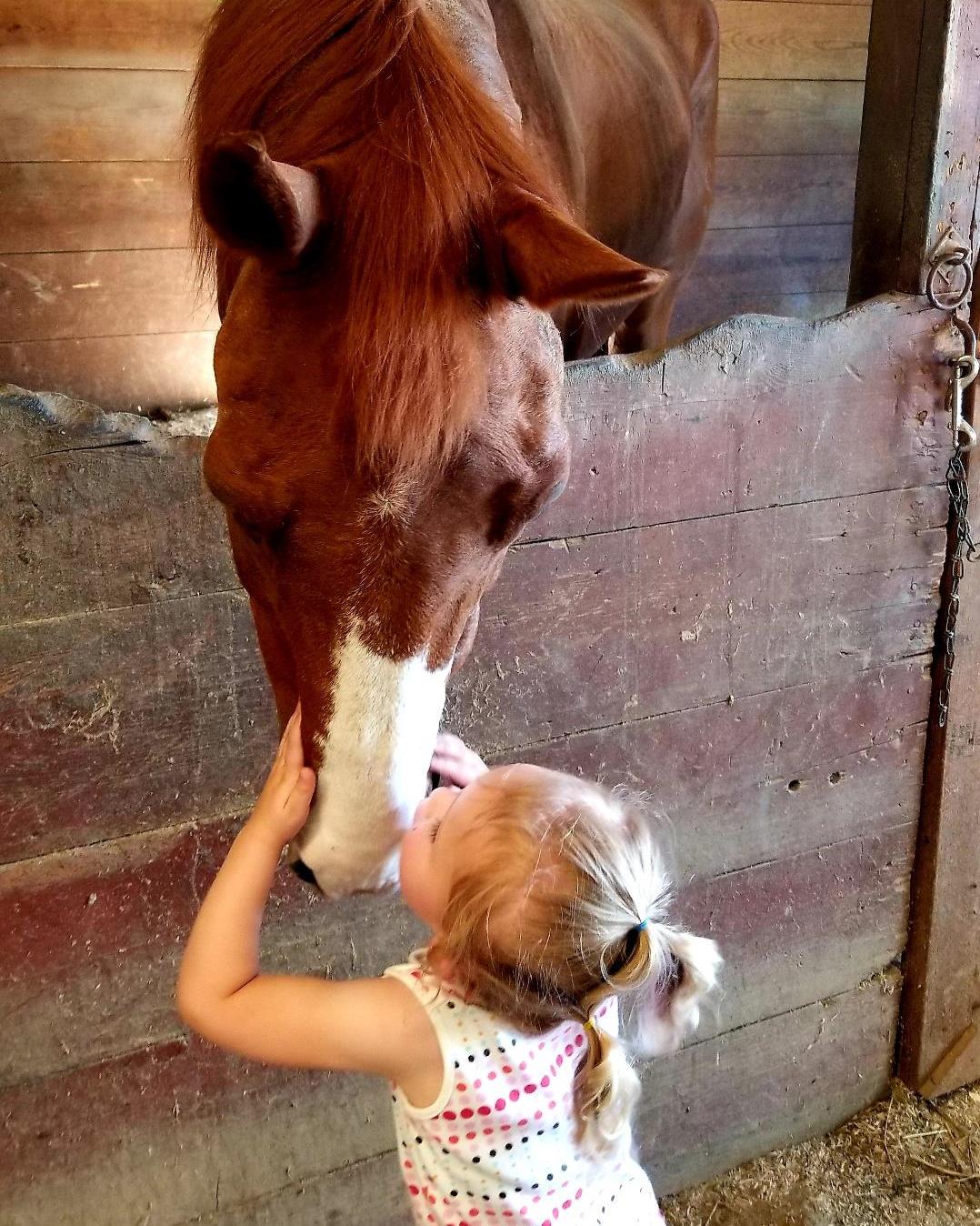 Young girl kissing brown horse`s nose.
