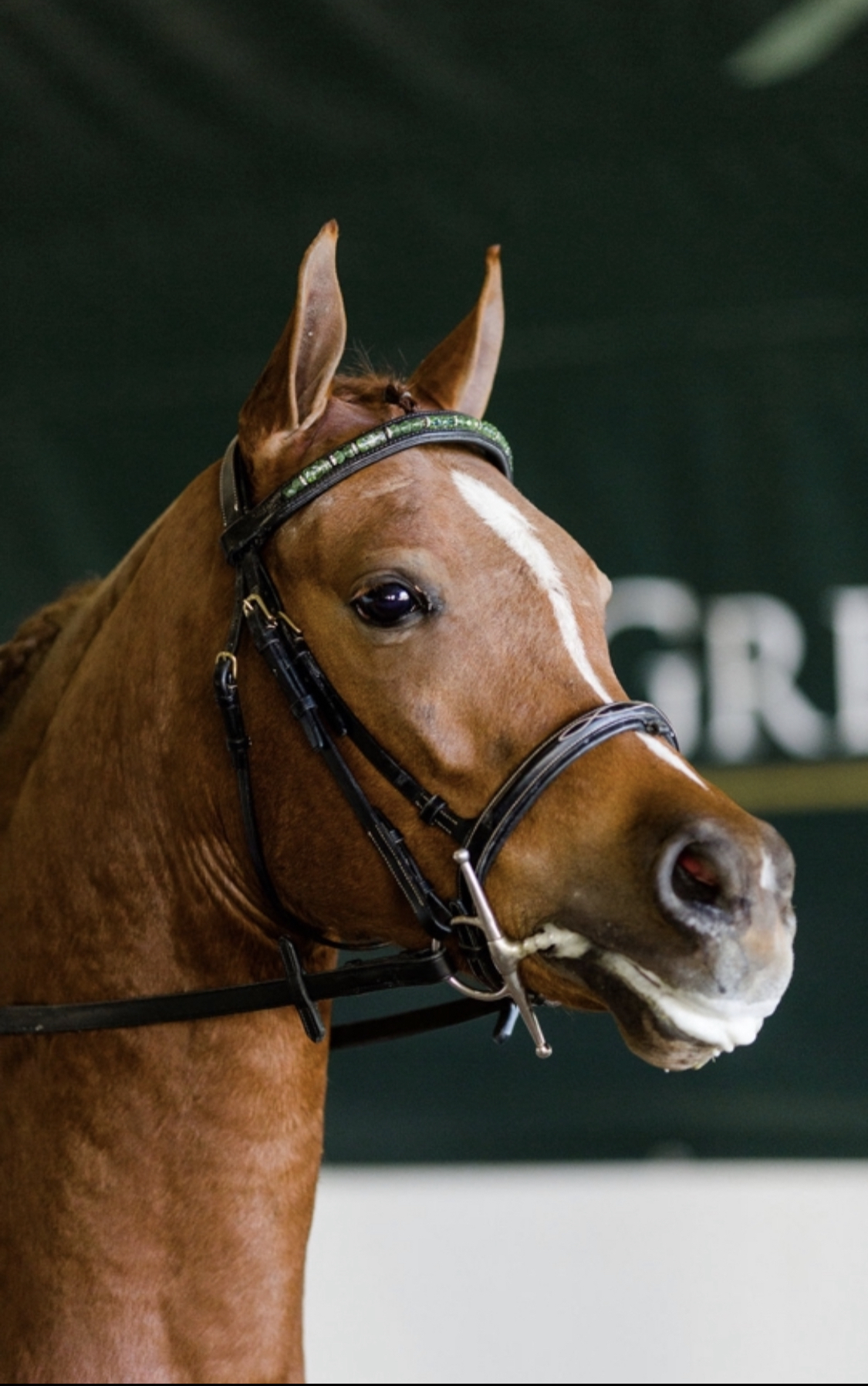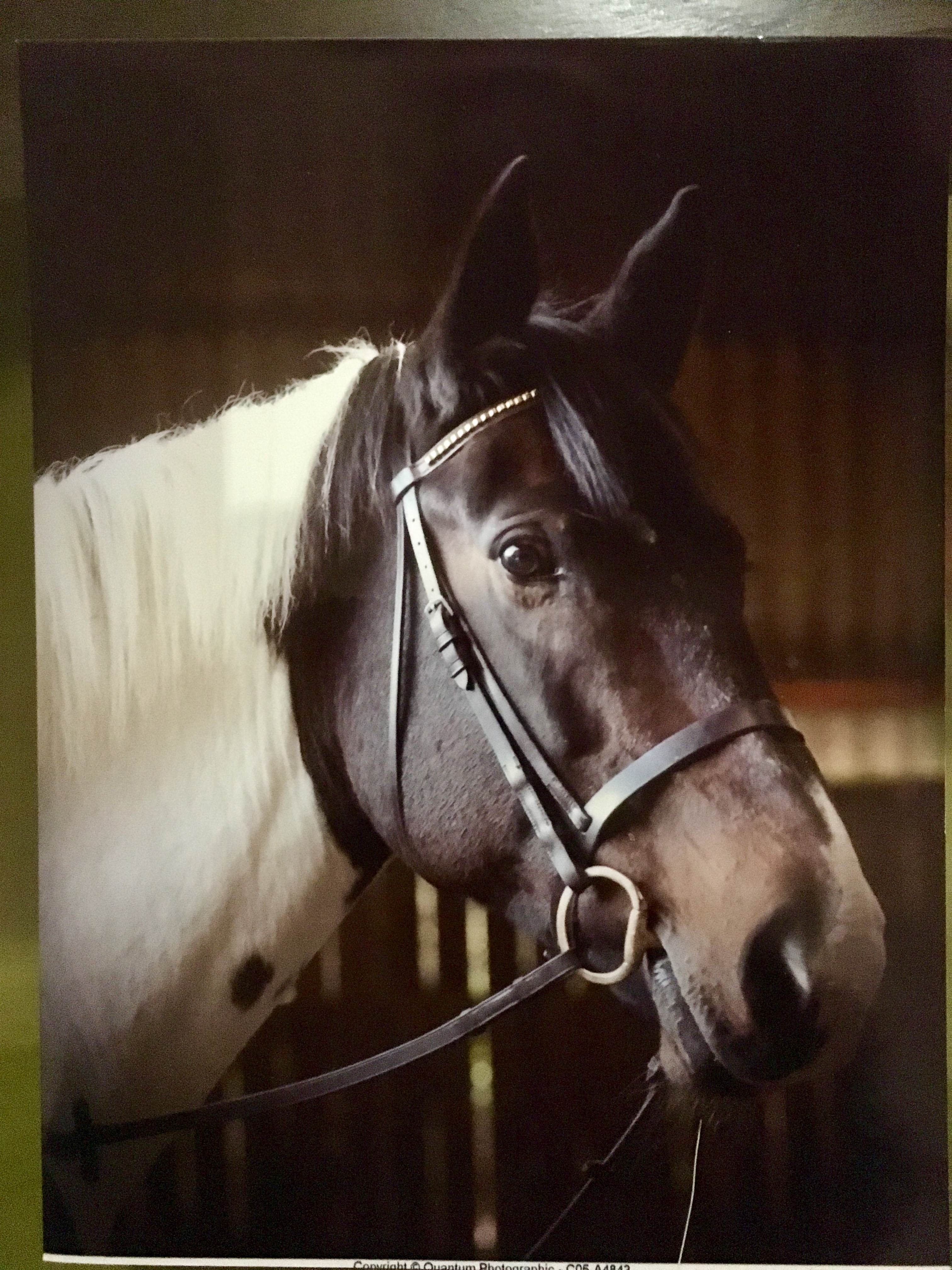 Painting of a piebald horse wearing a bridle in a stable