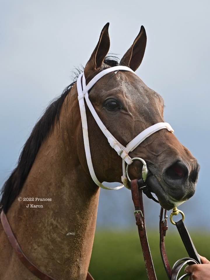 Painting of a chestnut horse with a white blaze, titled Fly High Logan