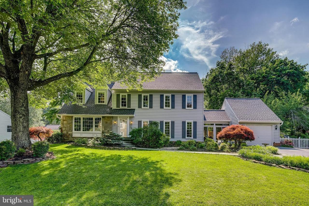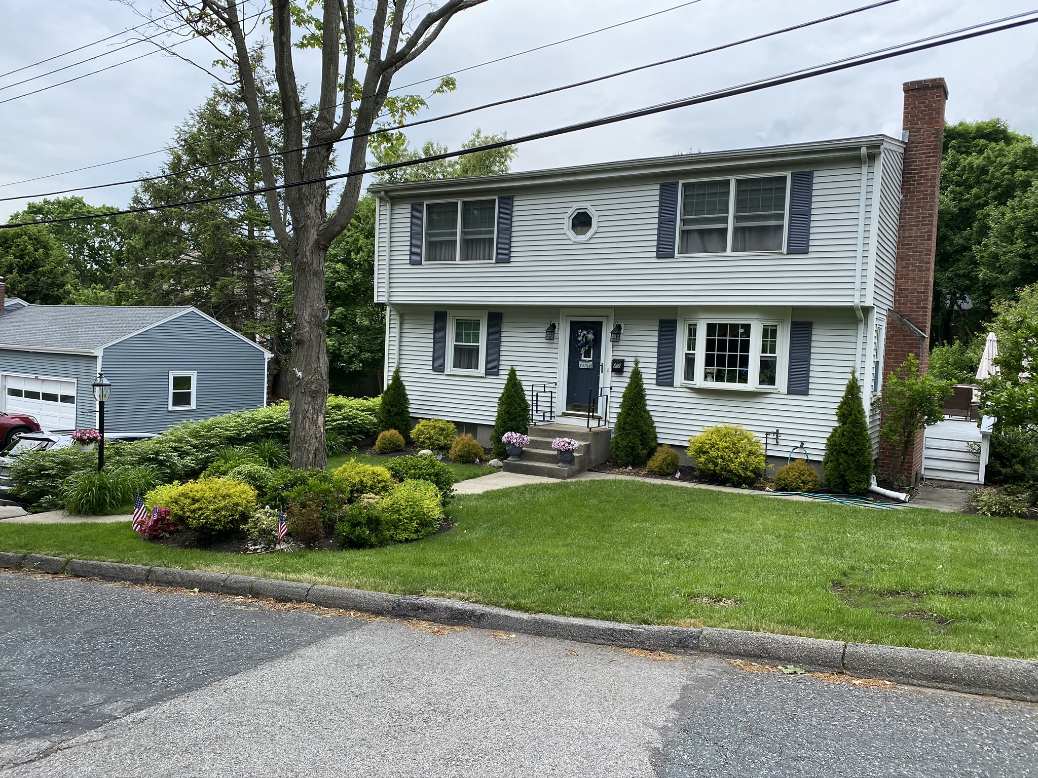 Painting of a two-story white clapboard house with blue shutters, a landscaped yard, and American flags.