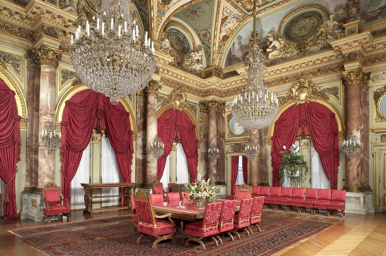 Ornate dining room with marble columns, red drapes, crystal chandeliers, and a large dining table.
