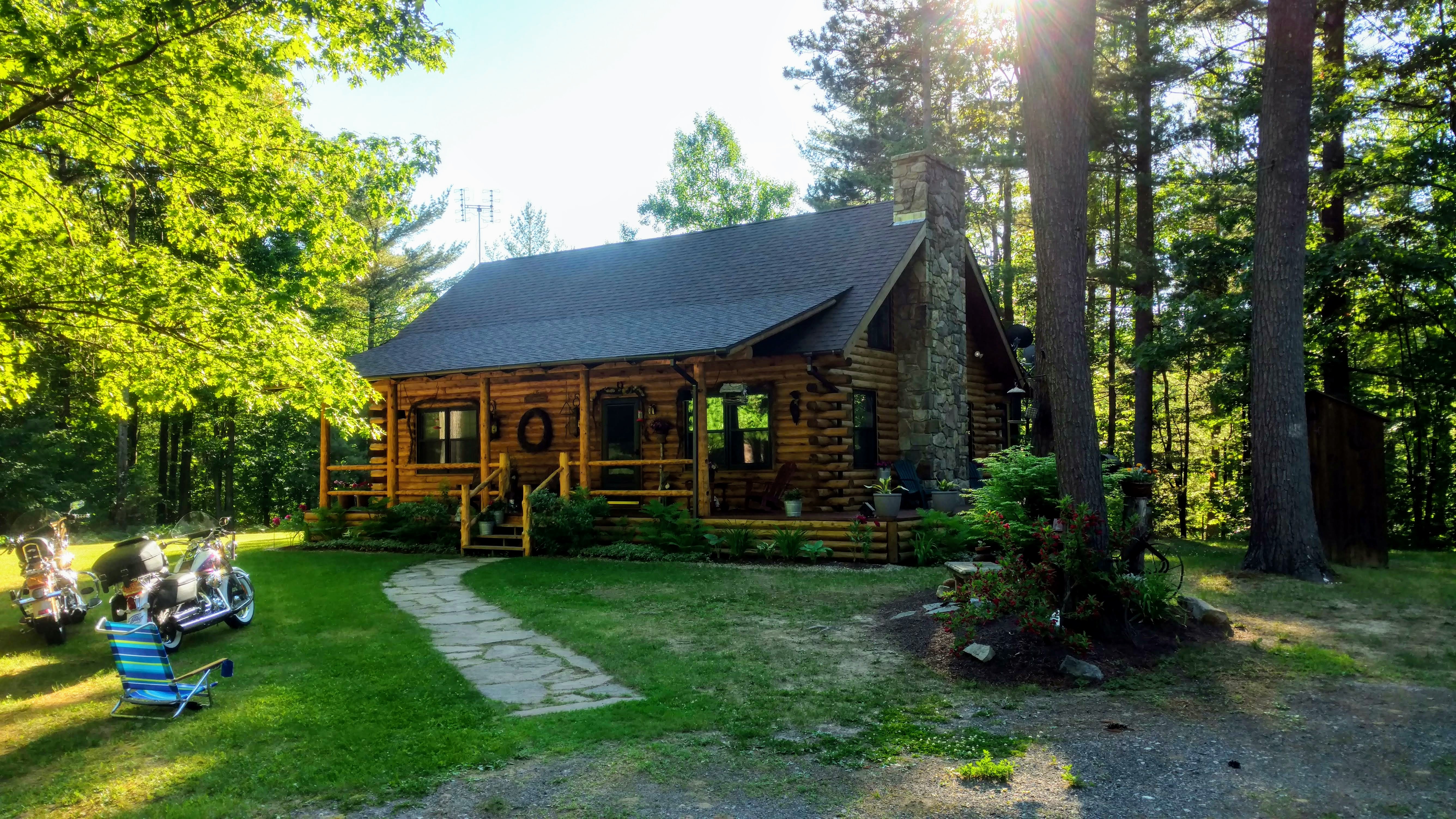 Painting of a log cabin with a stone chimney, blue roof, and a stone pathway leading to the front door.