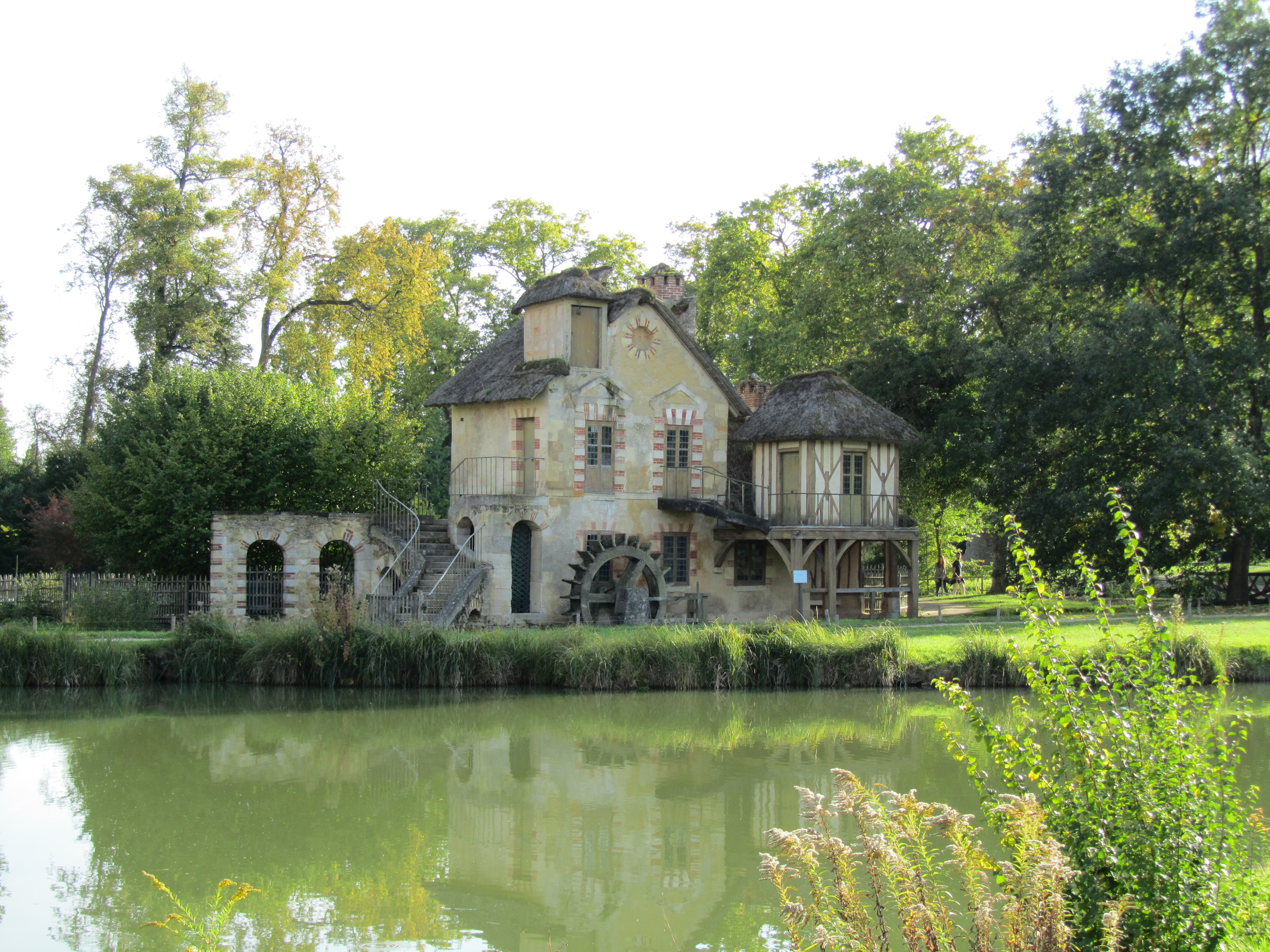 Painting of a watermill on a river, surrounded by lush greenery and trees under a blue sky.