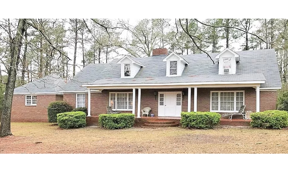 Painting of a brown house with a couple standing on the porch, surrounded by trees.