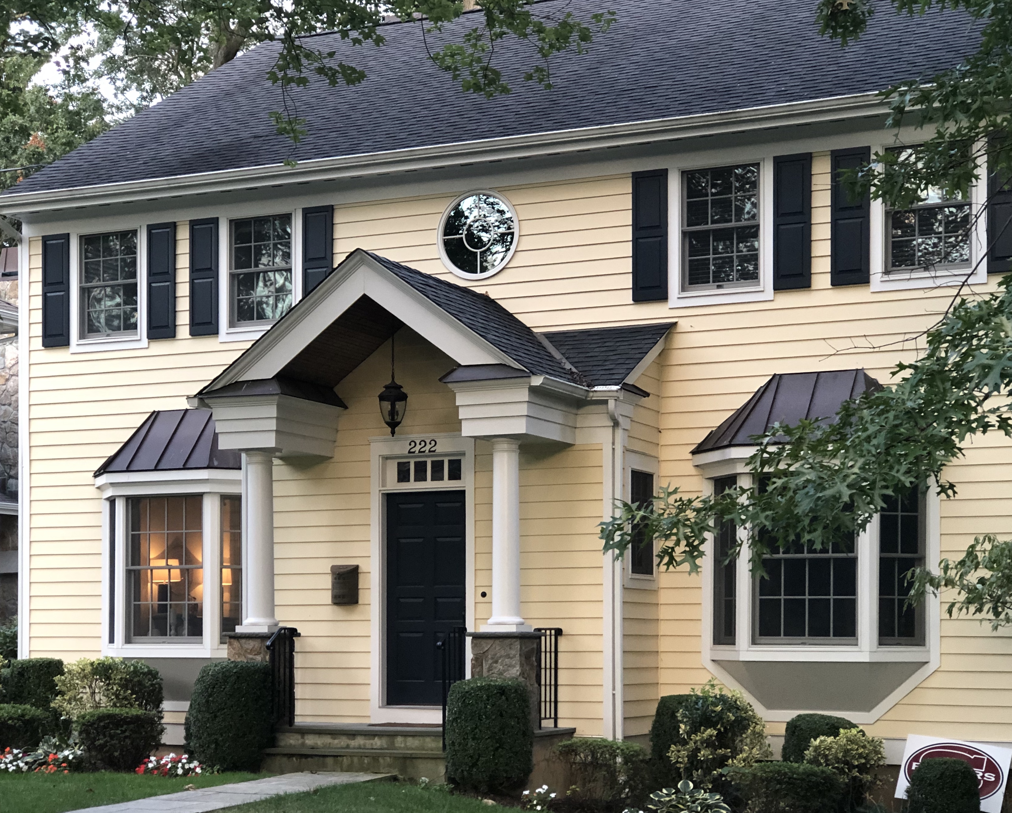 Painting of a yellow two-story house with black shutters and a dark door.