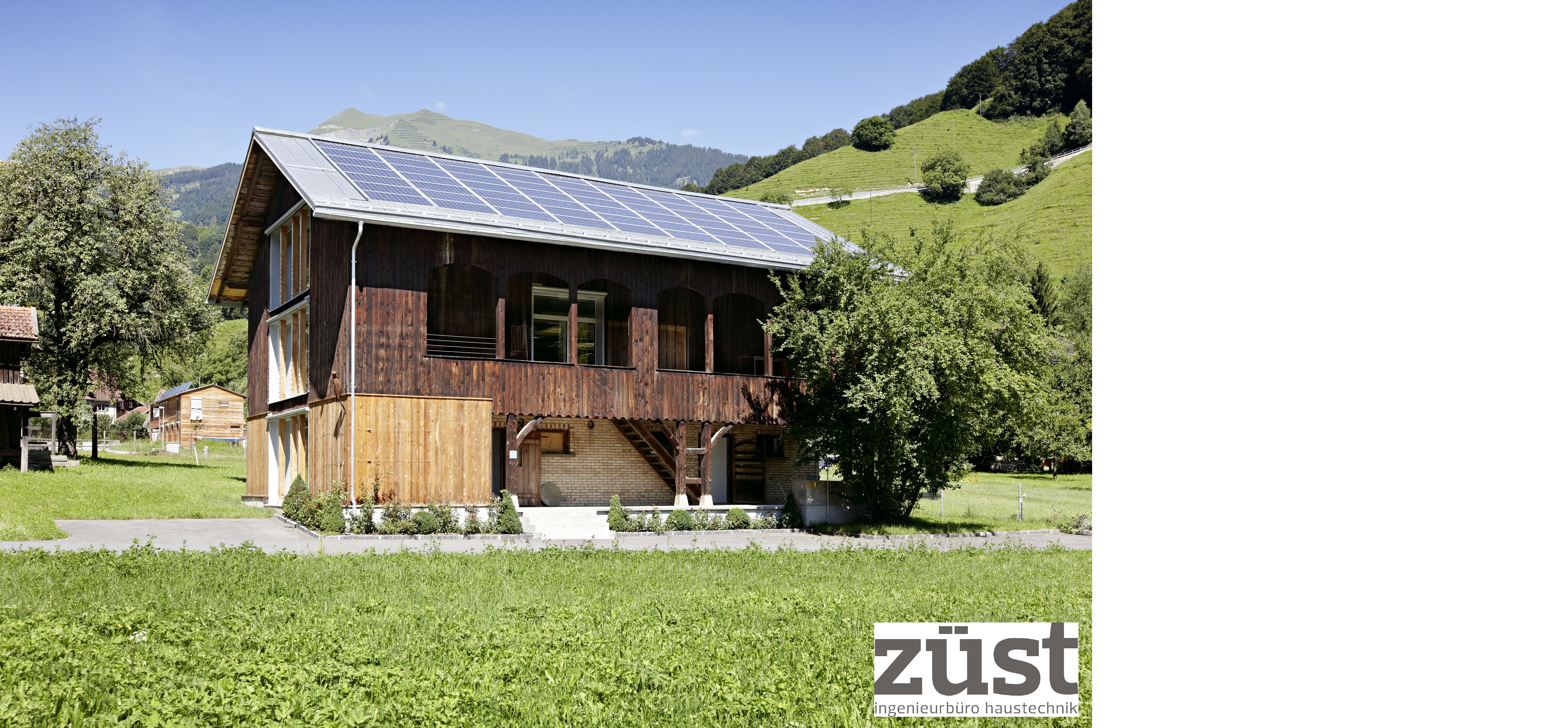 Black and white drawing of a house with solar panels on the roof, situated in a mountainous landscape.