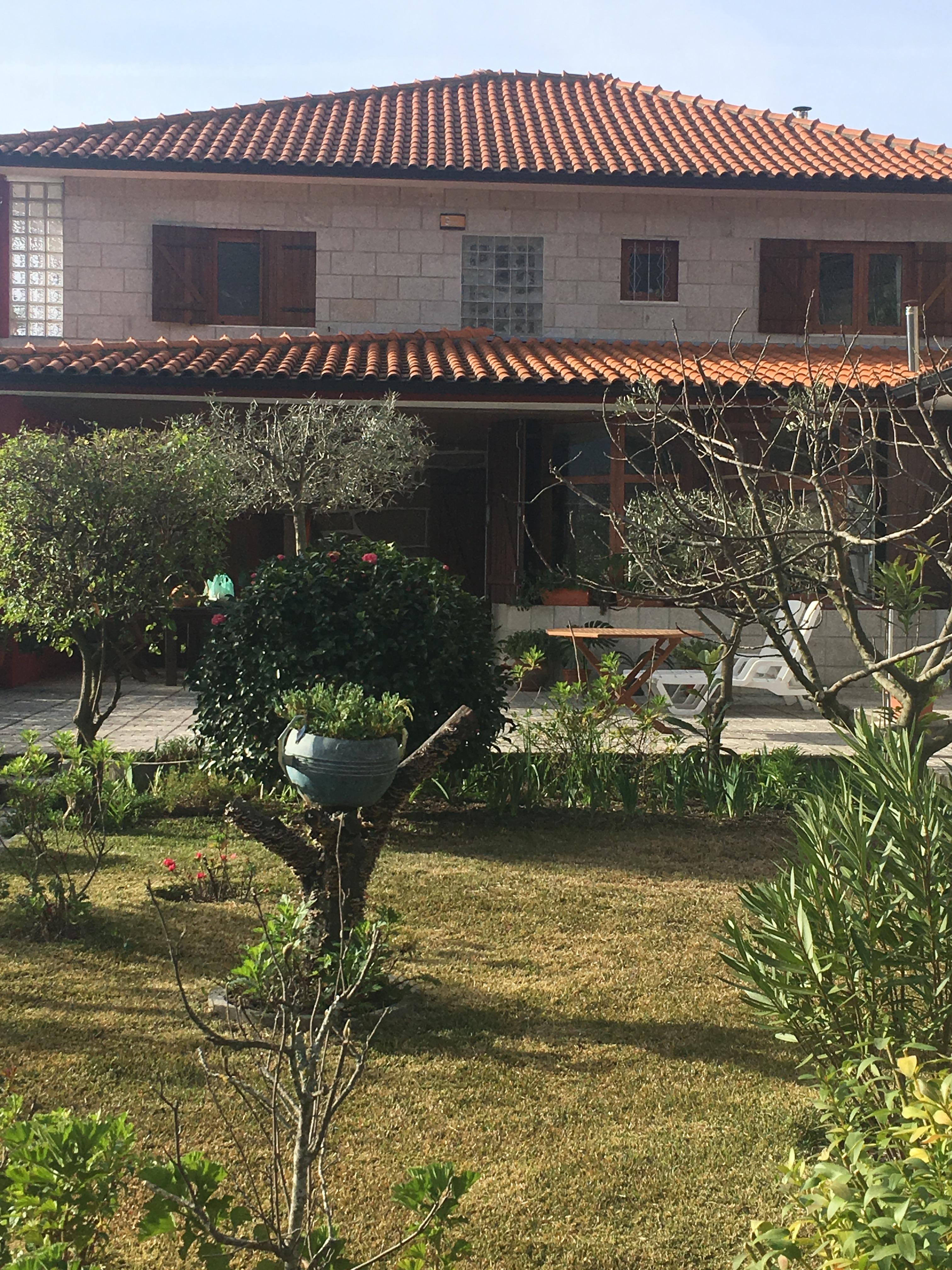 Black and white drawing of a house and garden.
