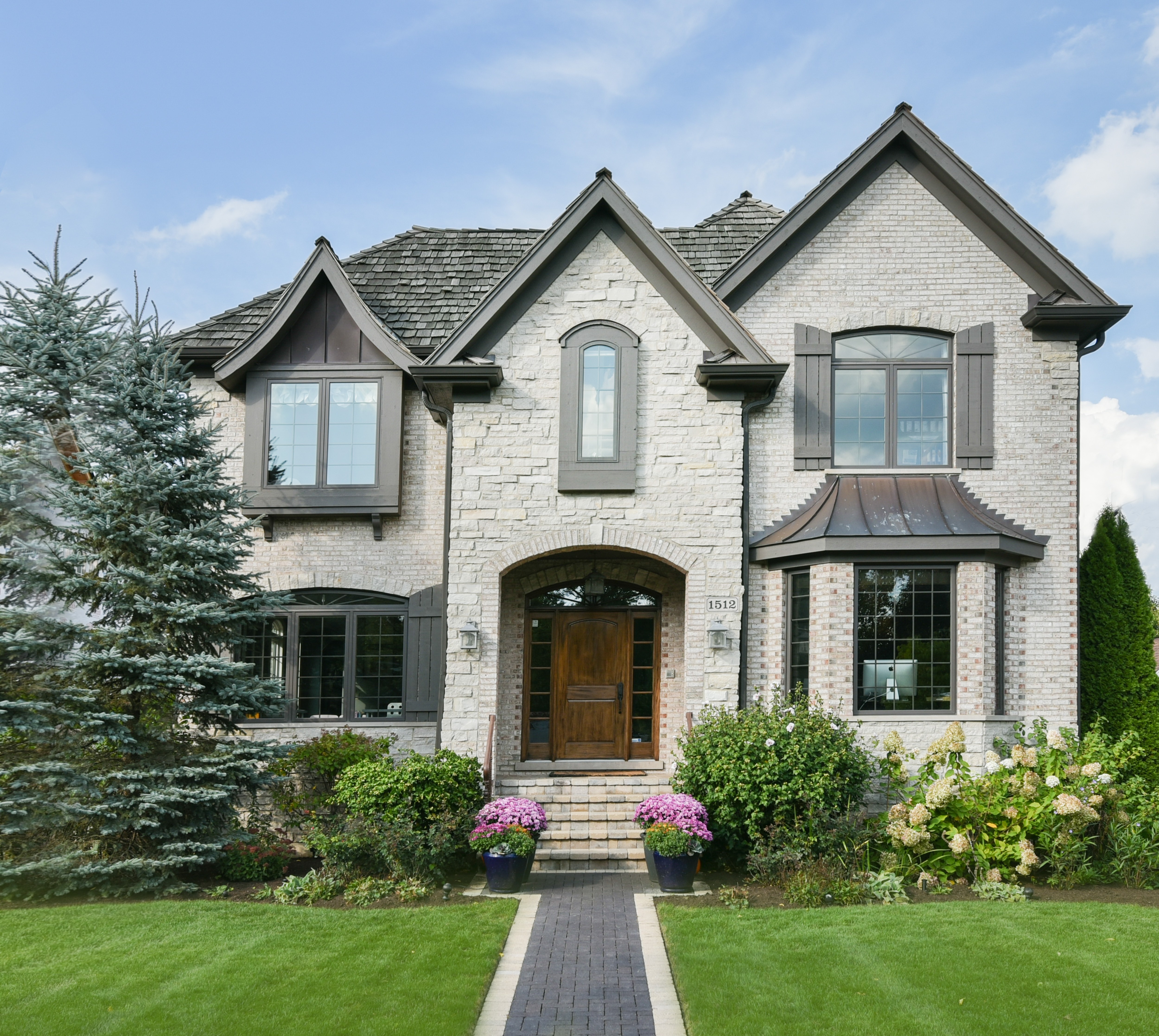Black and white drawing of a two-story brick house.