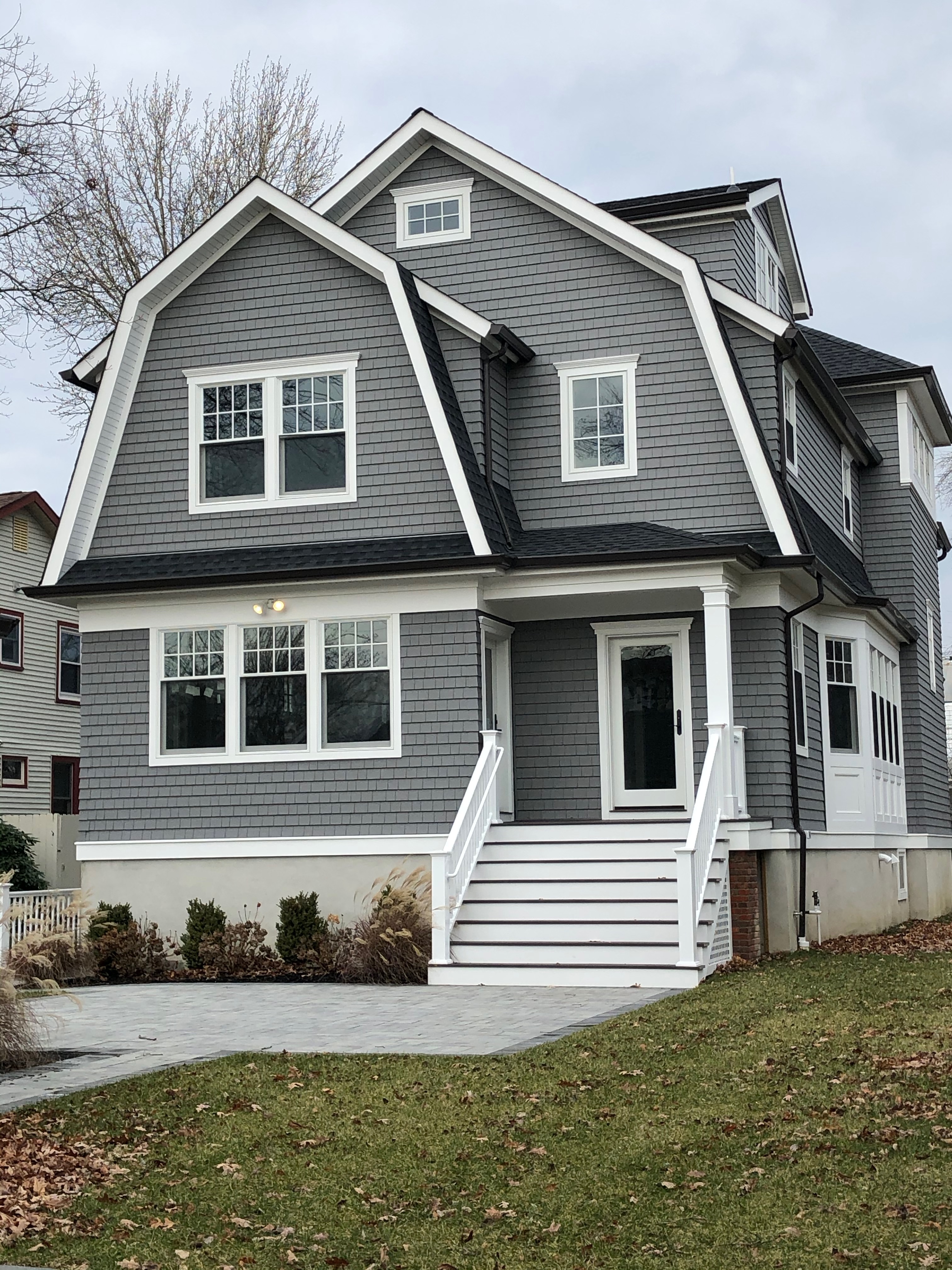 Black and white drawing of a two-story house with a gambrel roof and porch.