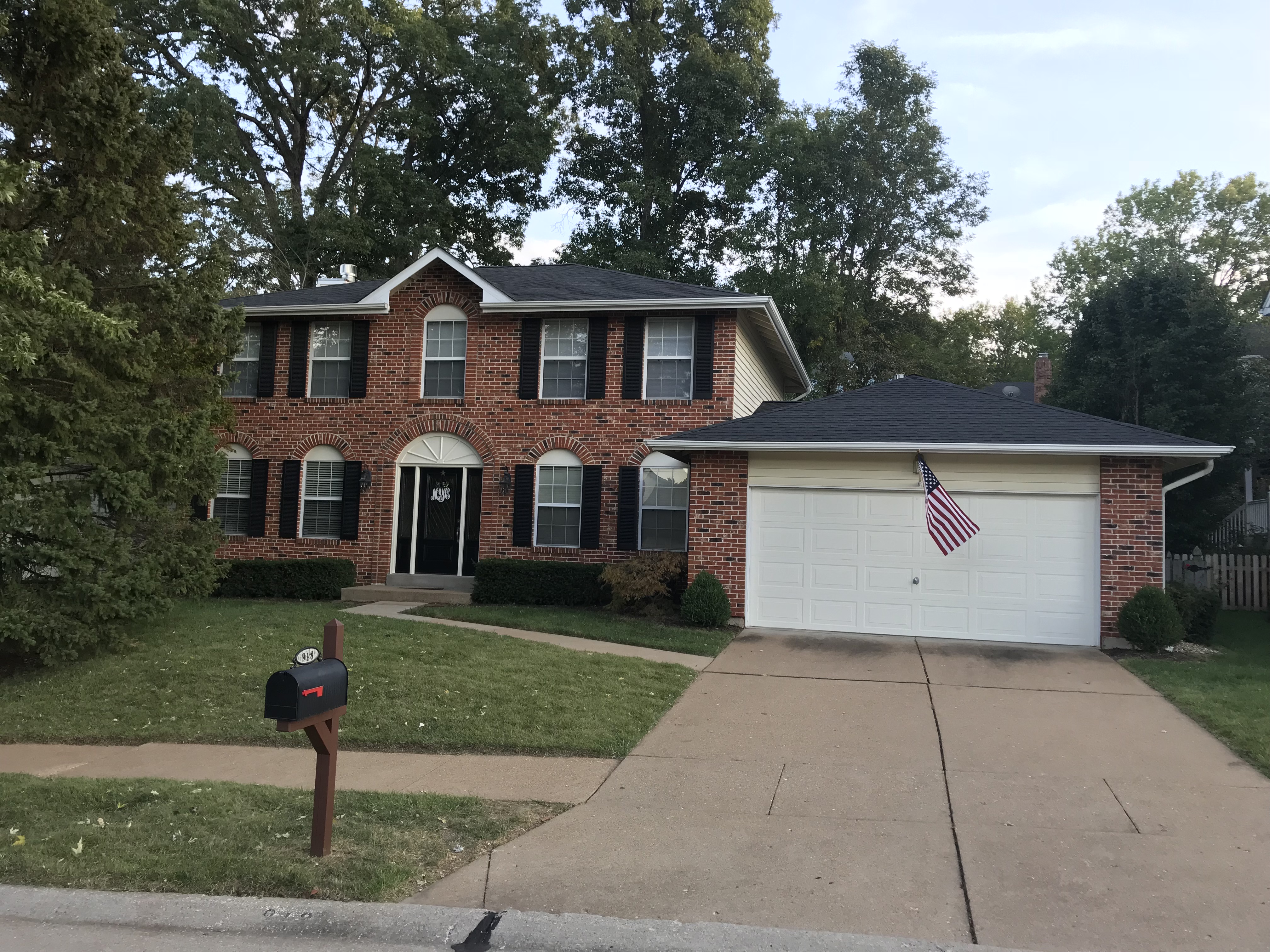 Painting of a two-story brick house with a white garage door and American flag.