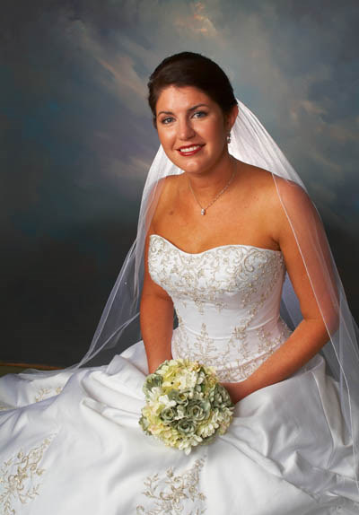 Oil painting of a bride in a white wedding dress holding a bouquet.