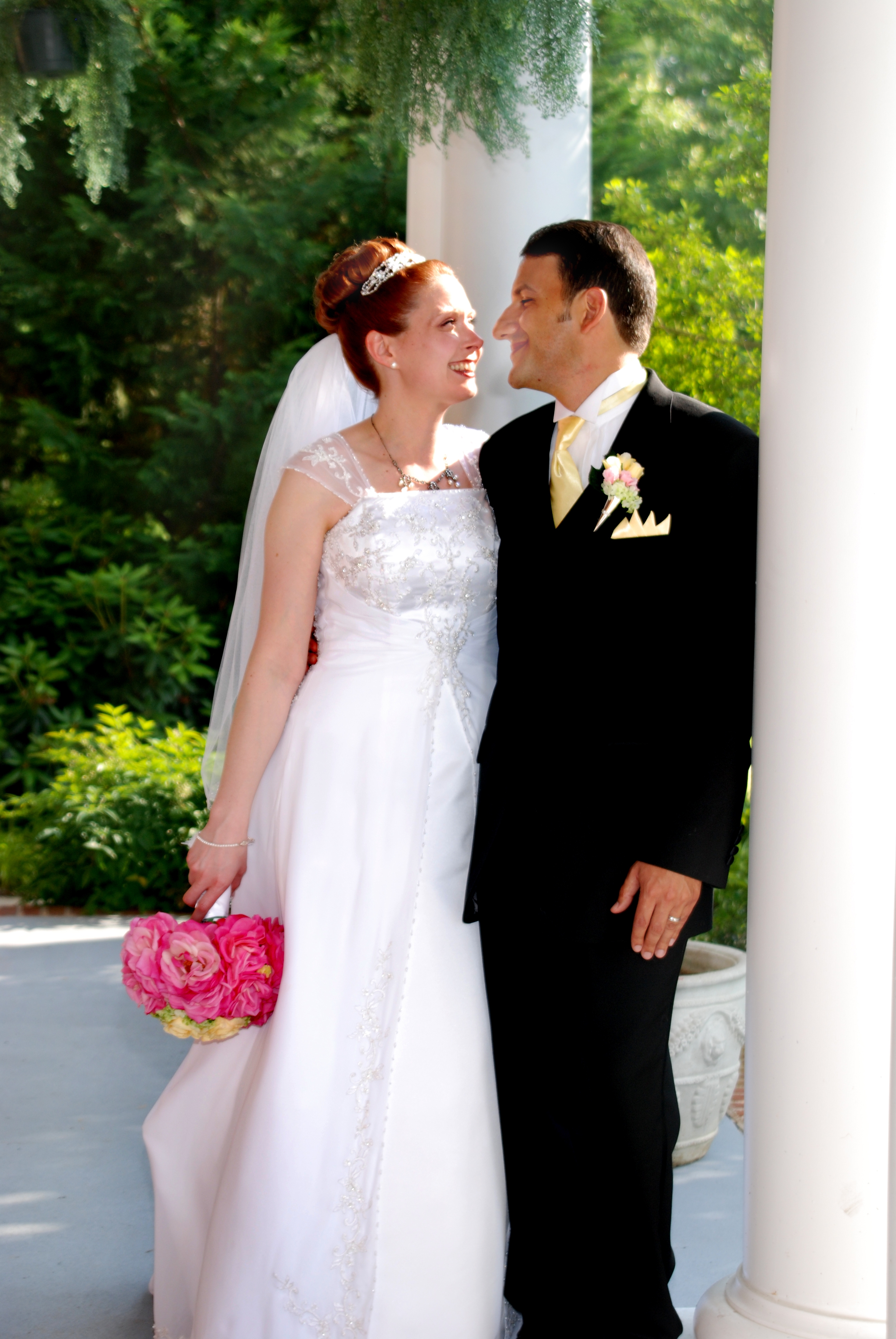 Portrait of a bride and groom in traditional Indian wedding attire.