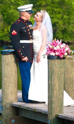Painting of a bride and groom on a dock, the groom is in a Marine uniform.