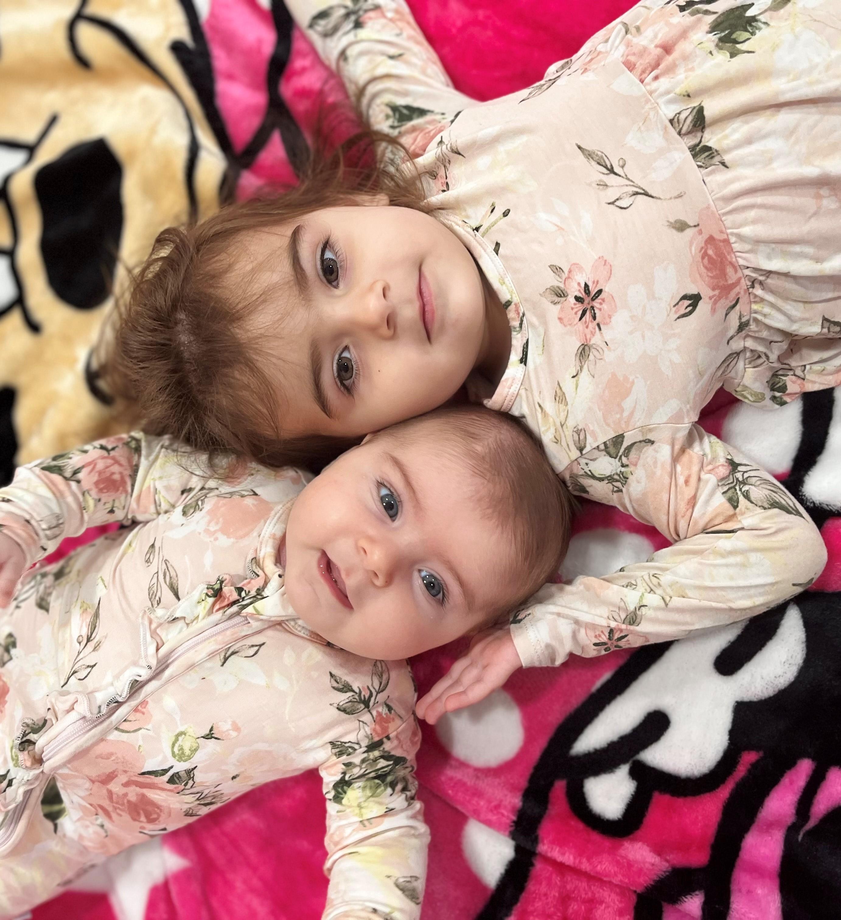 Painting of two young sisters lying down, heads together, wearing floral print pajamas.