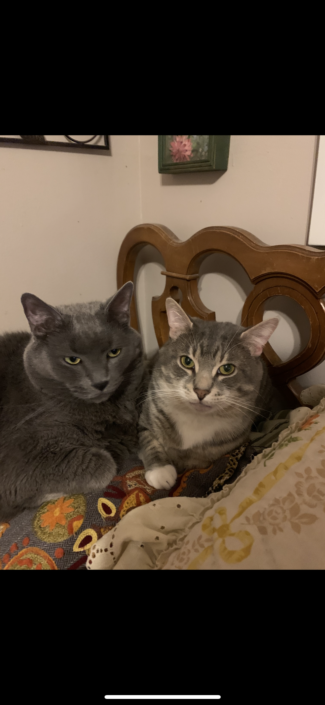 Painting of two cats, one gray and one tabby, sitting together on a chair.