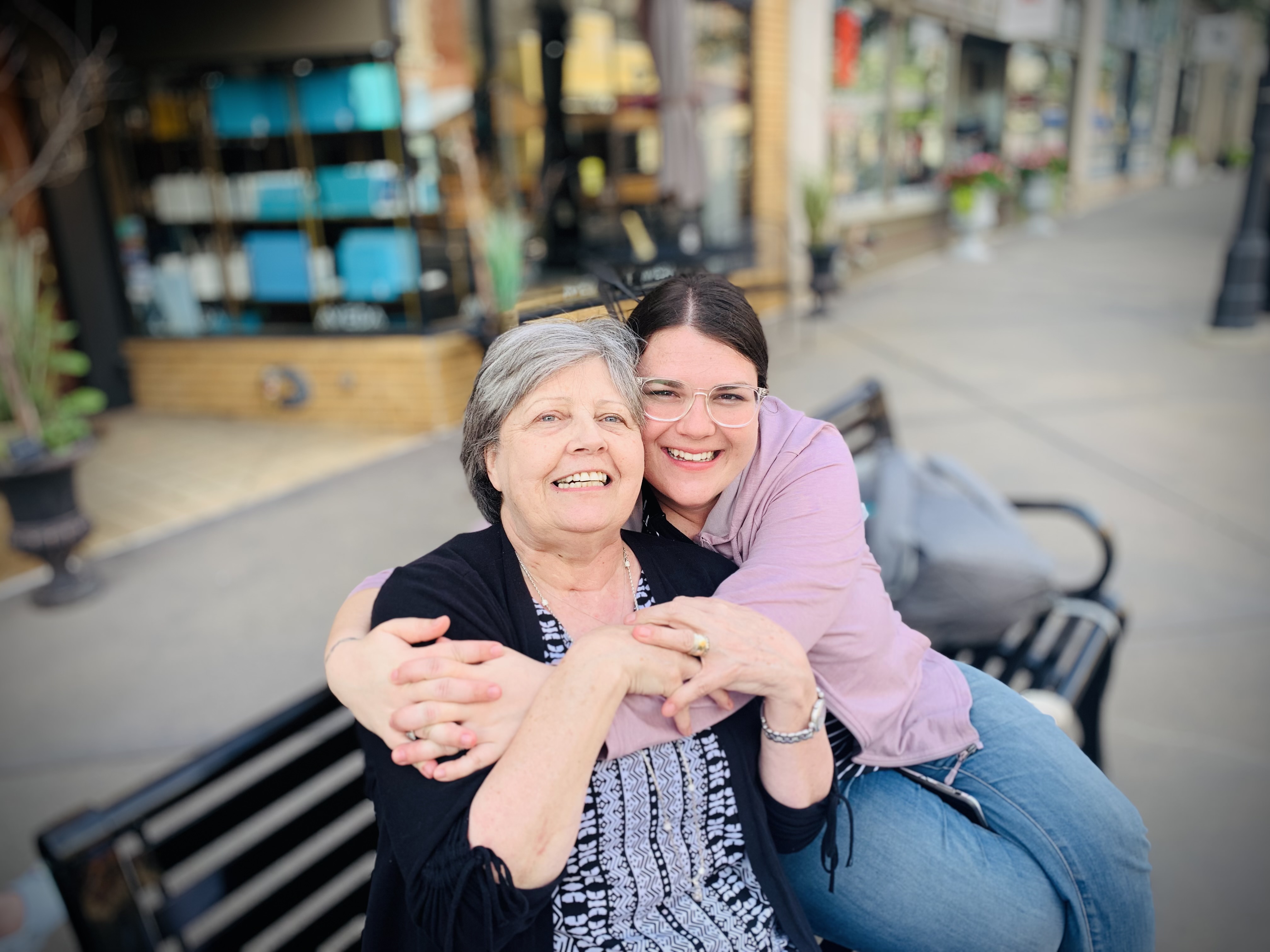 Painting of a smiling older woman and younger woman embracing