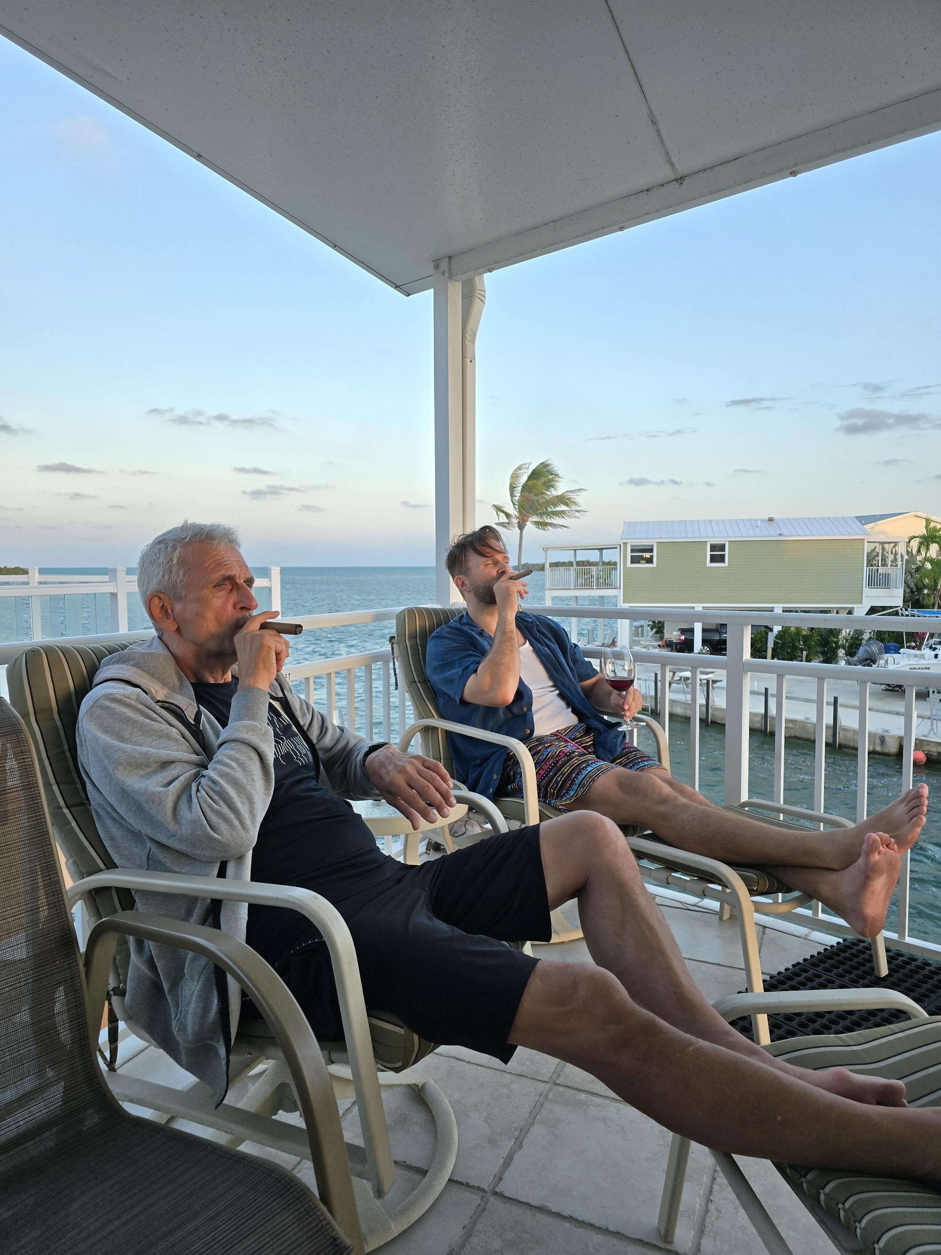 Painting of two men smoking cigars and drinking wine on a patio overlooking the ocean.