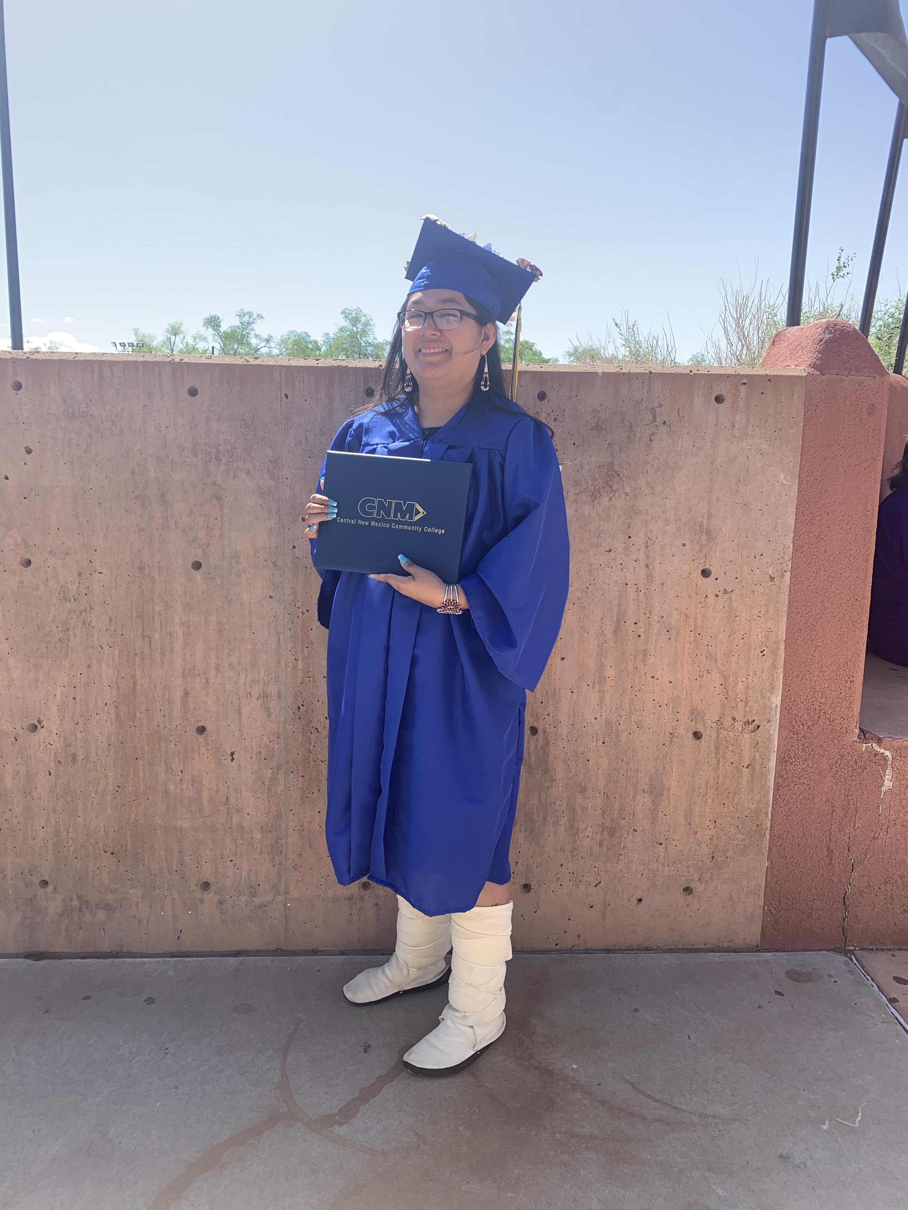 Painting of a woman in a blue graduation gown holding a diploma and a man in a bucket hat with a fist raised in the air, set against a landscape background.