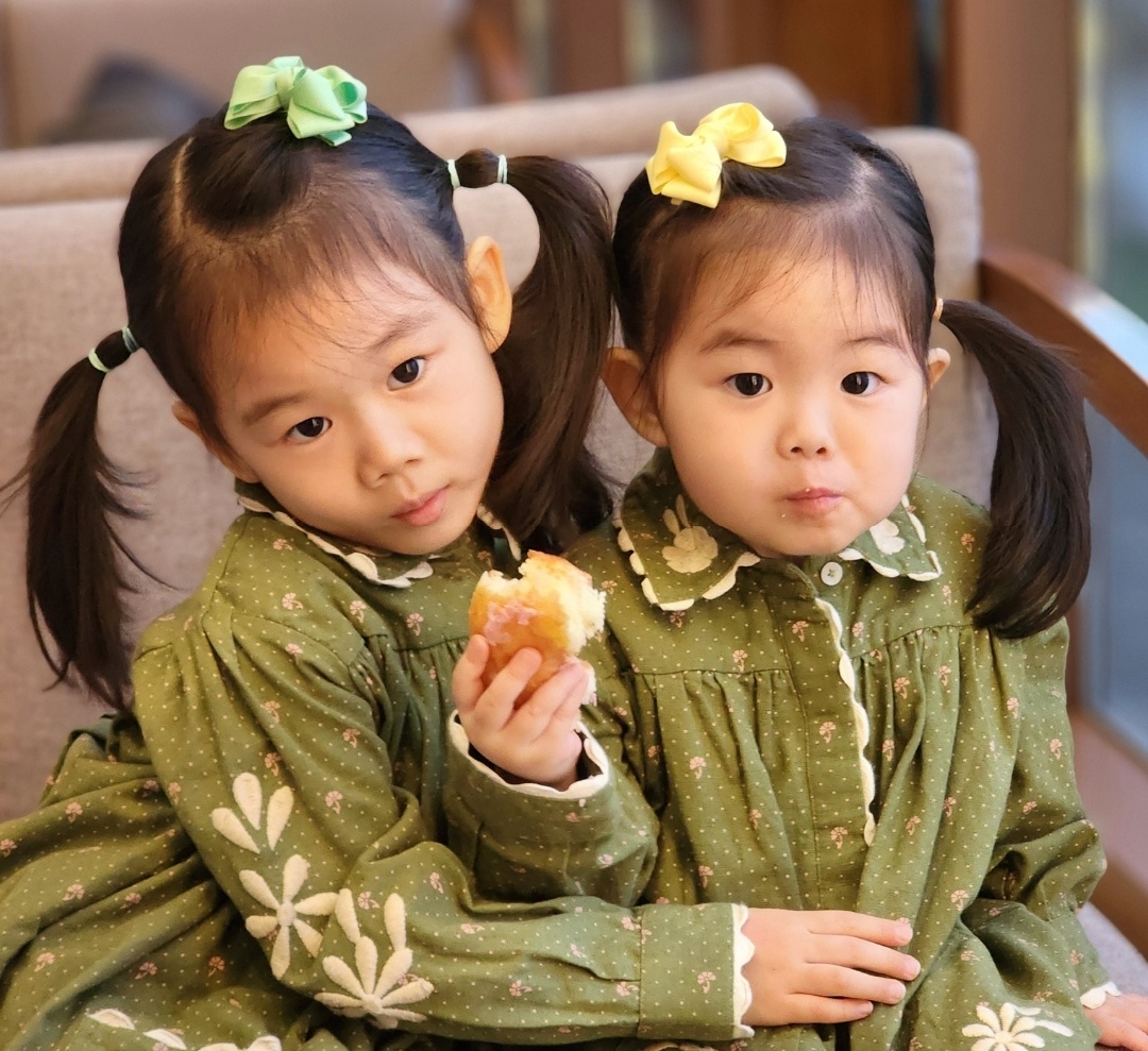 Painting of two smiling girls in heart-patterned pajamas standing on a bed.