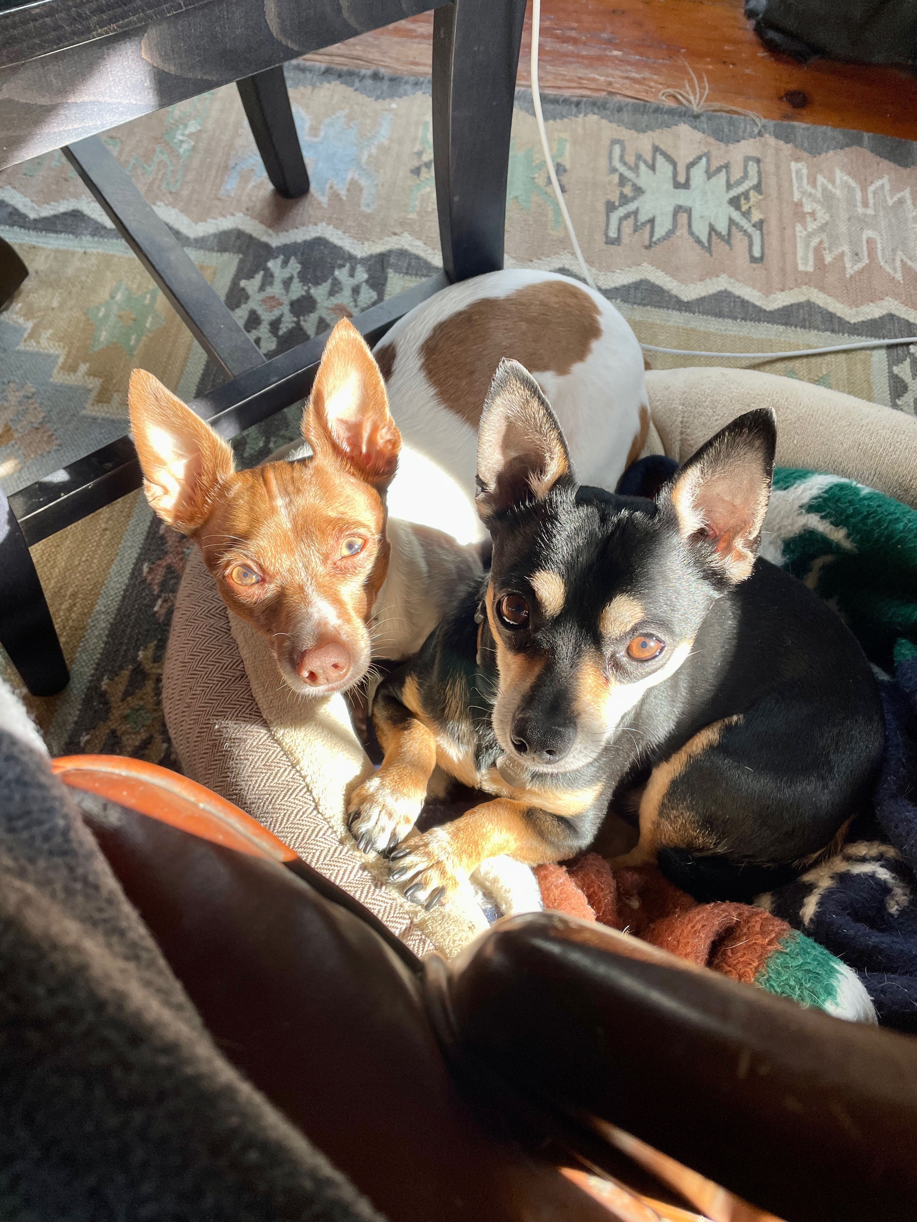 Painting of two small dogs cuddling on a blanket.