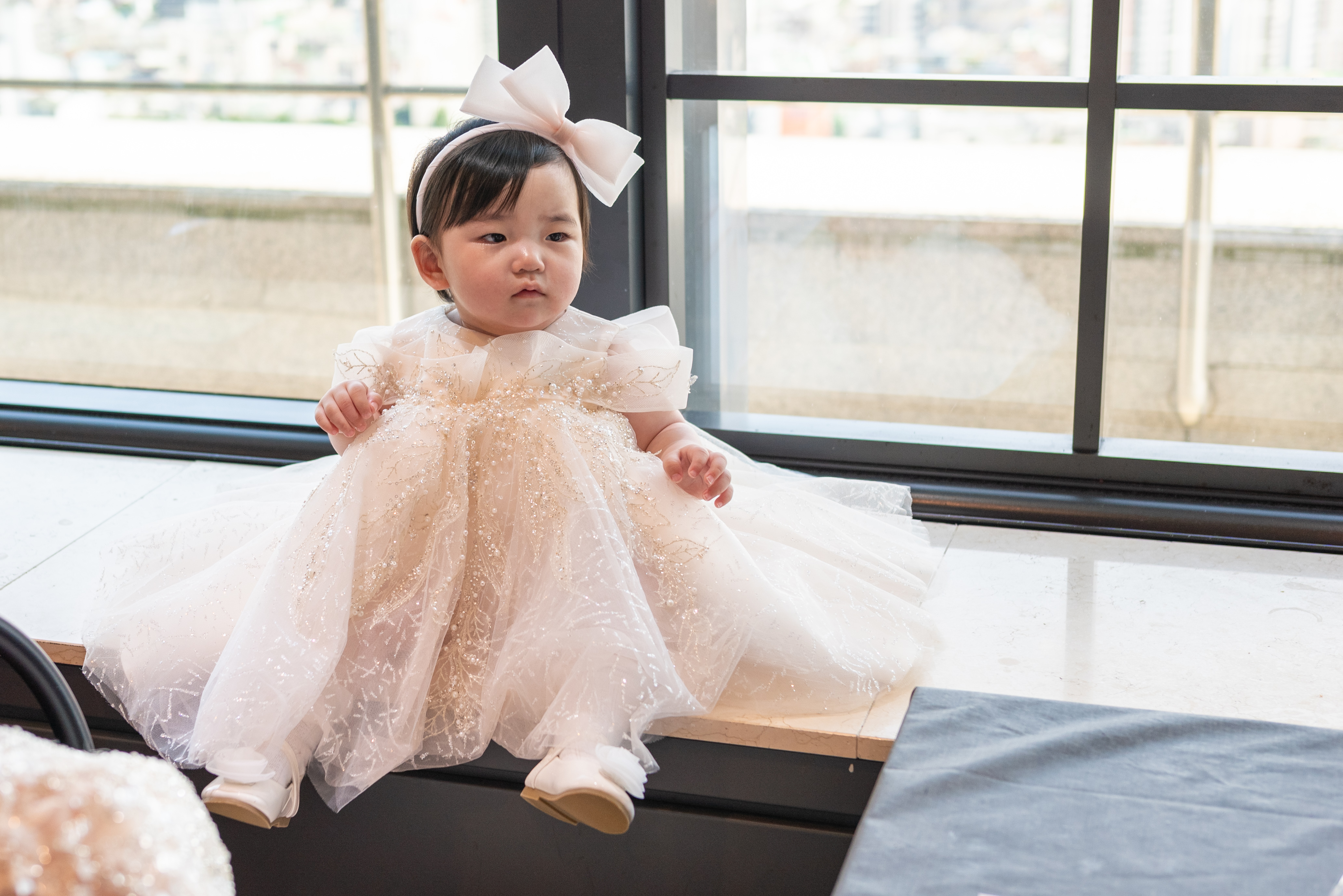 Oil painting of a baby girl in a large white dress and headband.